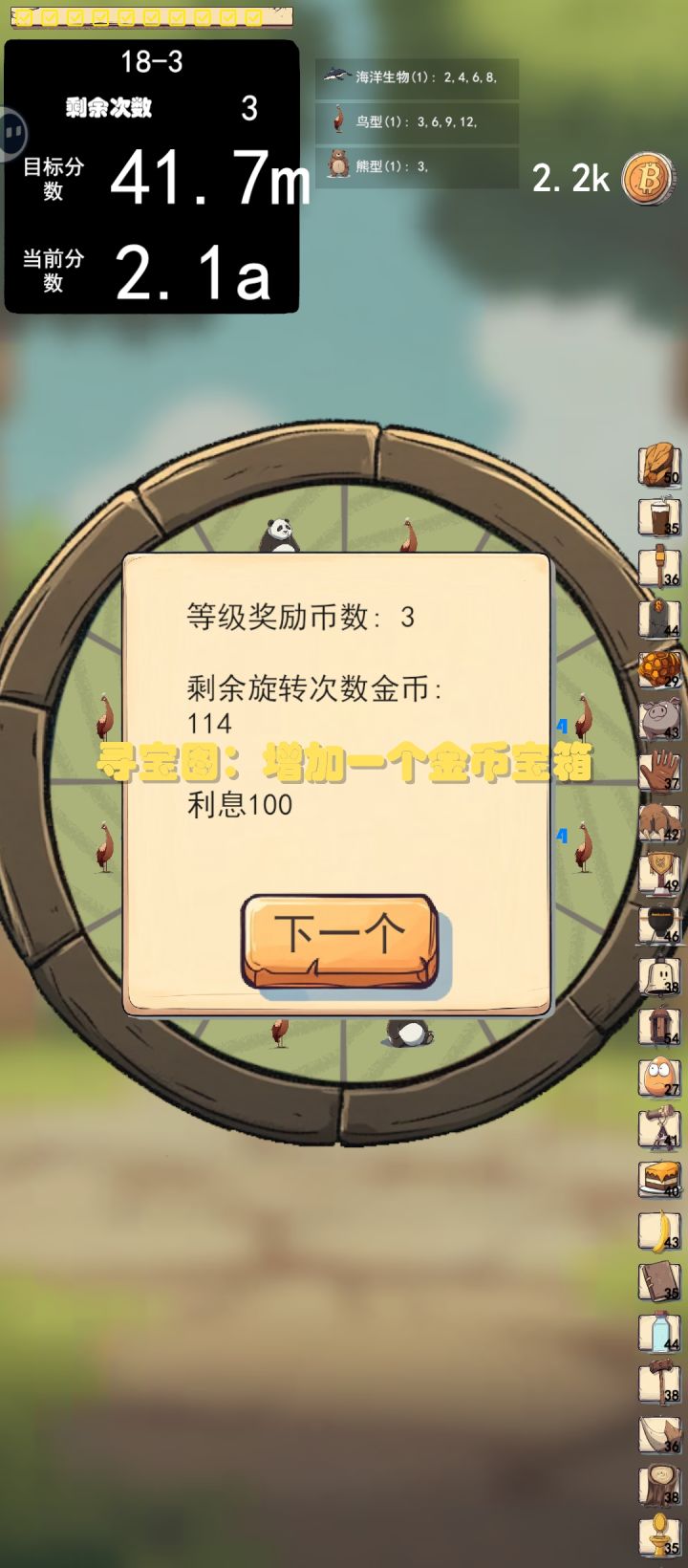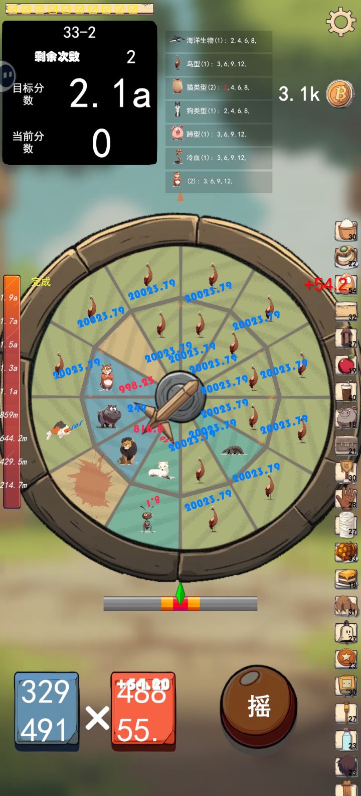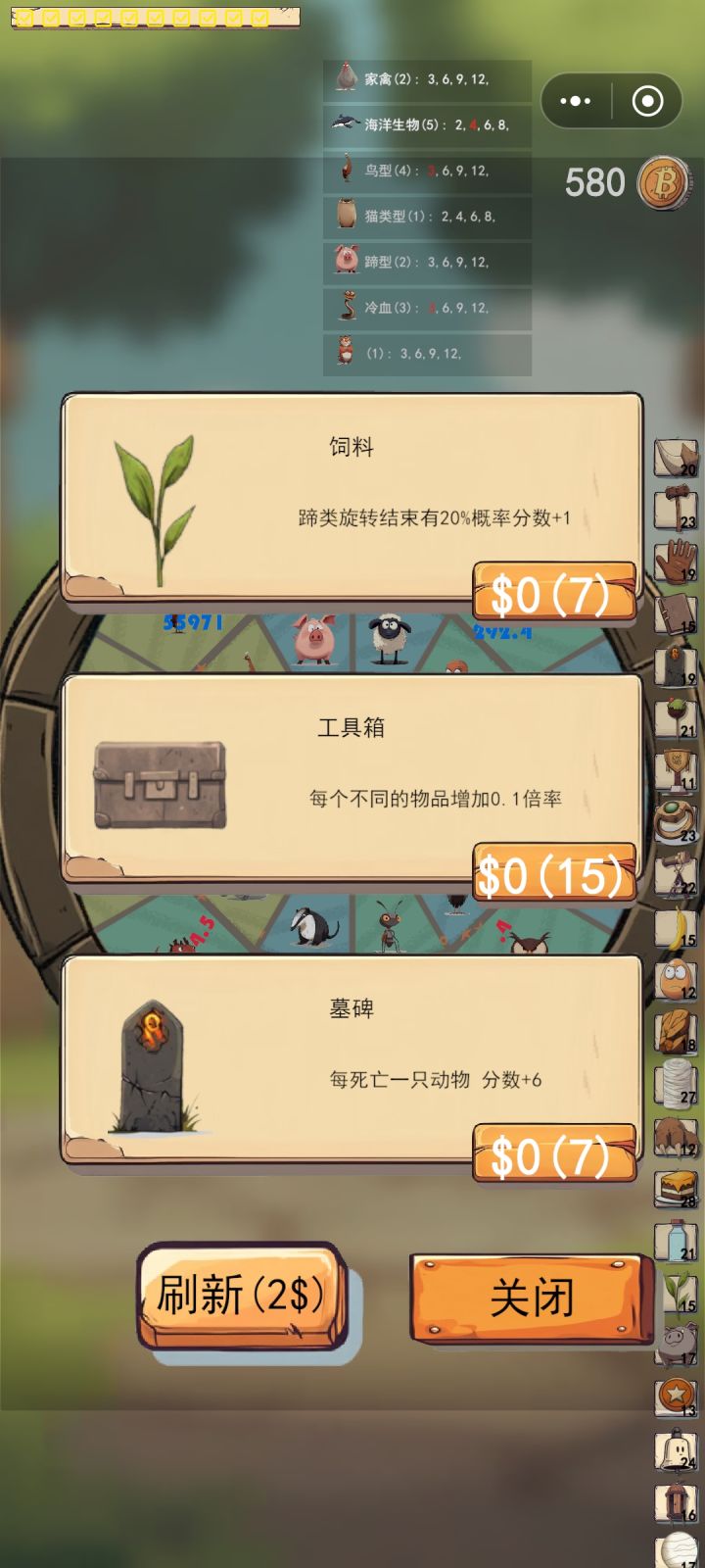 有点小小强迫症,通过鲸鱼和章鱼的组合叠加蓝色分,再用孔雀进行复制翻倍,大猩猩是为了加快速度多转几圈,用狮子和老虎咬白狐,白狐可以重复利用,也能继续翻倍。有几个注意的点,白狐的空位需要和数量一致,不然白狐会被咬死。章鱼我摆了半天最后决定只放一个,每次鲸鱼只吃一个,应该还会有更好的办法。猩猩比孔雀更重要,可以适当多放几个。开局就正常打,没必要凑这个阵容。道具优先选择存钱猪和打折券。前期也随便