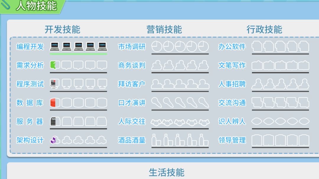 #职场浮生记攻略 技能级别越高,升级所需经验就越多;但与对应npc搞好关系所获得的卡牌,是每次直升0.5星的。 也就意味着初期最好用看书练技能,到2.5星后再去找对应人物,能比较简单的一次性升满。 已有技能对应npc一图流如下: (基于pc端正式版,如果手机端有差别,不是我的问题) 其中,角色在雷云集团的位置一般需要经过剧情推进解锁。初期,雷云的很多地方主角都没法去。 多周目奖励的“雷云通”