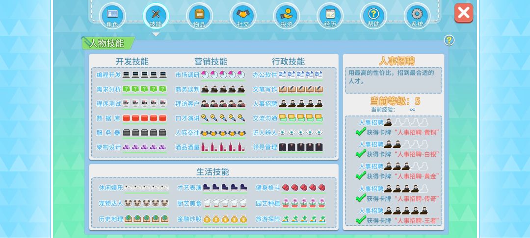 按难易优先级整理!跟软一线(程序员线)是有略微差异的! 新增了北区理发店、厦门航空、华夏航空三个投资项目。 不要技能点没满足就傻乎乎开始卡牌战斗啦![表情_晕了]会导致后手出牌,压力暴增且进度要求暴涨! 强烈建议开局周目币选择编程天才,直接开发编程5☆,前期投资不要太好用! 前期投资推荐: 1.前期推荐北区-理发店起手,无需战斗,市场调研0.5星即可开展调研。8万现金+编程开发1星即可直接拿下,每