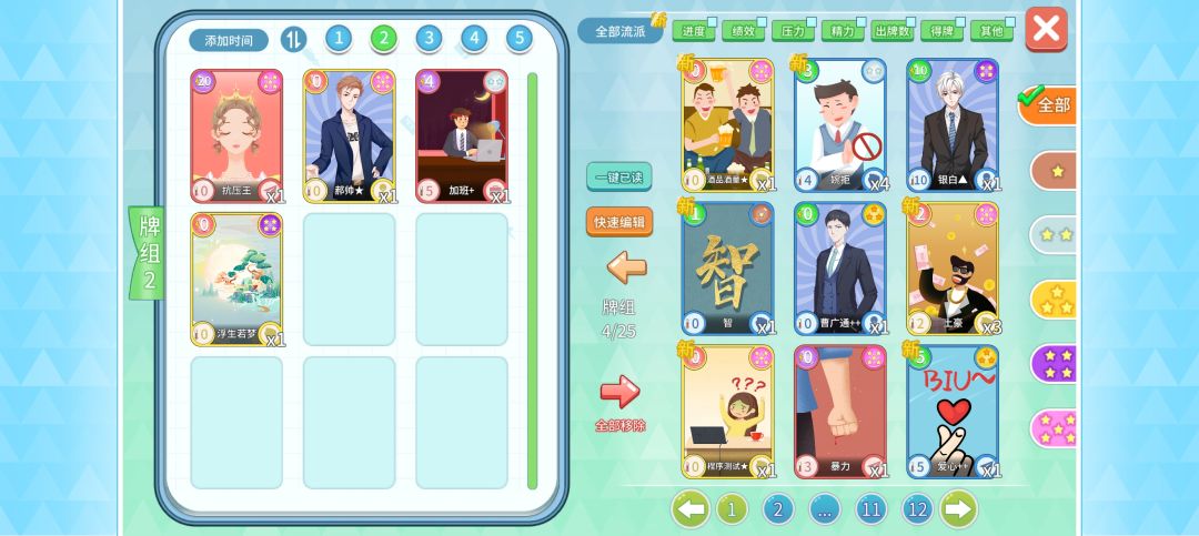 带上这四个,先手放一个加班,再放抗压王,然后浮生若梦跟郝帅两个从回收站里来回刷精力,精力够20就可以用一回抗压王,可以不用下回合,直接刷过关#职场浮生记攻略 #烂尾楼