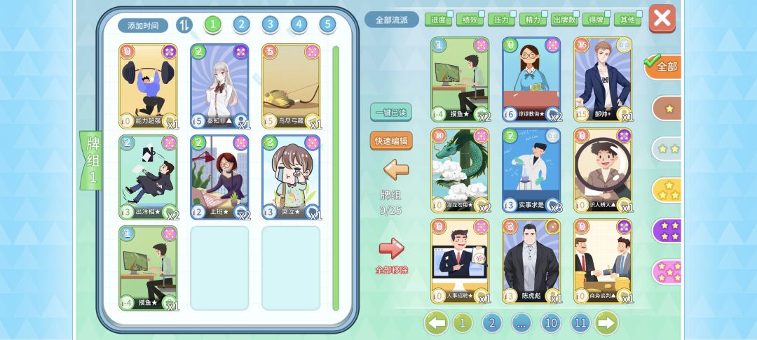 这套卡牌可以直接用到这游戏通关,卡牌如下: 三张摸鱼×一张砍一刀(可在碎片商店刷新)×鸟尽弓藏一张(也是碎片商店刷新)×浮生若梦两张(也是碎片商店刷新)×精力充沛一张 公式如下:起手牌=鸟尽弓藏(个人习惯清空场上所有事件牌)⇒摸鱼⇒浮生若梦覆盖摸鱼(从回收站回收鸟尽弓藏和摸鱼)⇒摸鱼(位置随便)⇒砍一刀(消耗一张手里的摸鱼)⇒鸟尽弓藏(回收场上所有卡牌到手中)⇒摸鱼⇒浮生若梦覆盖摸鱼(回收鸟尽弓藏