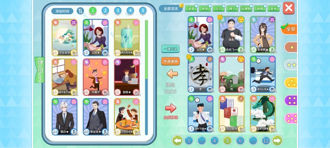 #职场浮生记攻略 循环卡牌: 可以通过刷好感获得的: 银白与郝帅(这两实现无限循环), 李文婷与陈宝瑞(这两实现无限精力), 大舅、魅力型男、大帅哥(凑数用,因为五星银白必须回收五张牌,所以需要不增加压力不消耗精力的牌来凑数) 然后通过刷新卡牌商店来随机出一张回复回合出牌点数的牌,并升满级,比如摸鱼流的画饼,加班流的愣头青,都可以,不会用太多碎片就能随出来,如果碎片不够可以回档或者分解除了这套卡