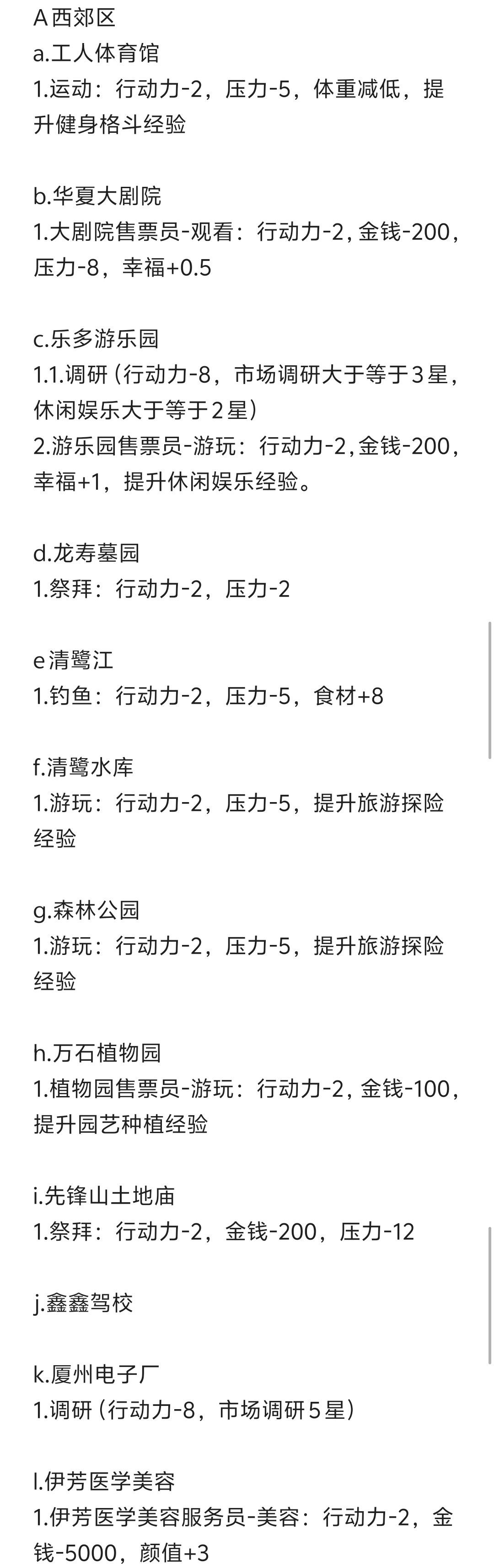 如图,我花了六个小时把所有场景里的选项挨个选了一遍。 大写字母ABCD等代表的是区域, 小写abcd代表的是该区内的各个场景, 数字1234代表各个场景可以交互的内容, 如果某个场景底下一个数字也没有,则证明该场景没有可以交互的内容。 至于为什么发图片,因为发文字的话,我的文字已经达到了6500多字,而帖子的上限是1000字,所以只好发图片了。 (E区南湾区和F区新城区我放在同一张图片里了)