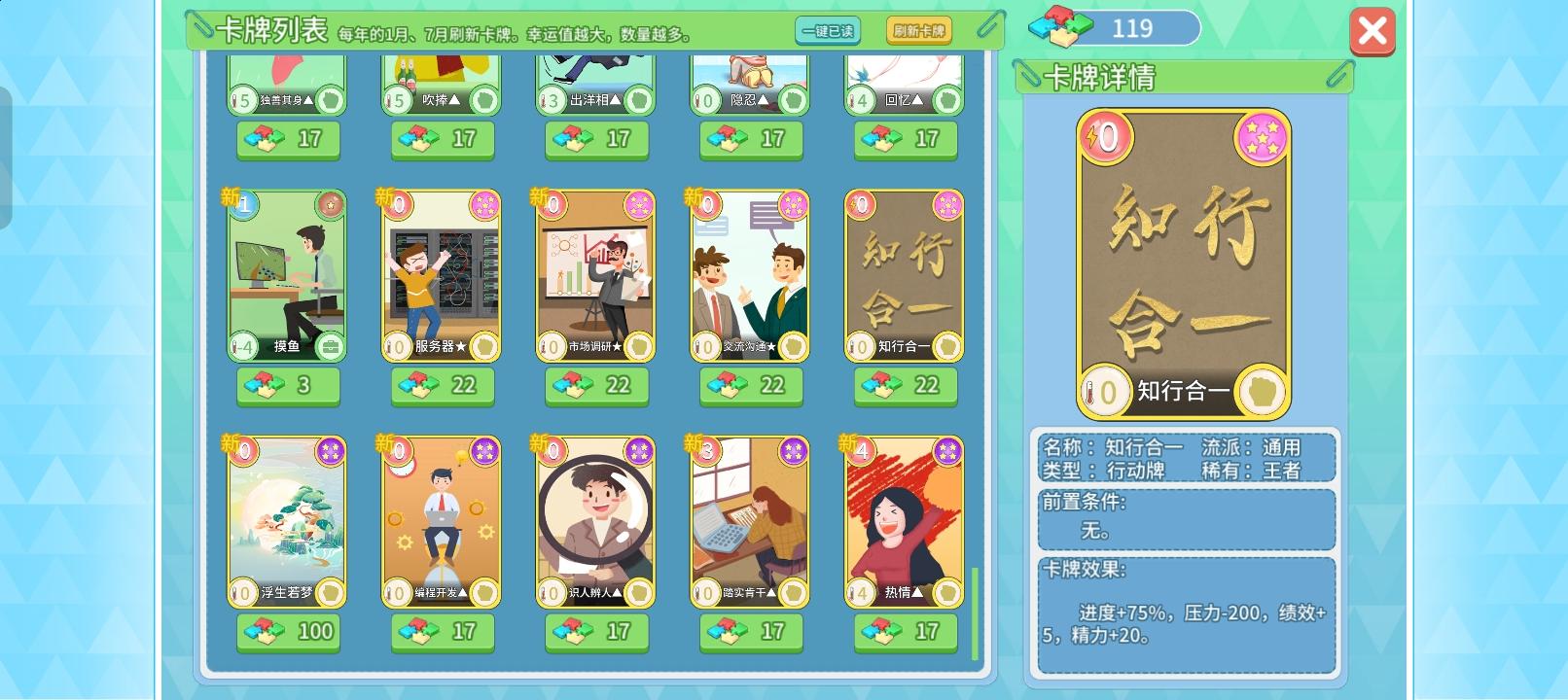 #职场浮生记 终于拿到完整的知行合一了。那个卡牌商店随机必须得拿。然后他隔壁那个随机卡牌就别拿了,那玩意纯靠脸。你要是脸白,给你一堆和选项对应的神牌。你要是脸黑,全是垃圾牌。