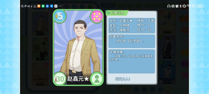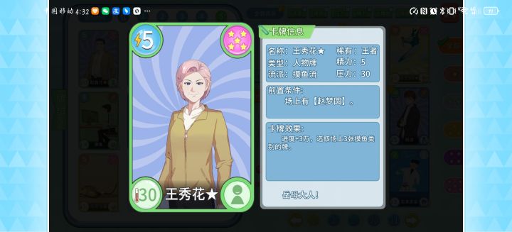 这套卡牌可以直接用到这游戏通关,卡牌如下: 三张摸鱼×一张砍一刀(可在碎片商店刷新)×鸟尽弓藏一张(也是碎片商店刷新)×浮生若梦两张(也是碎片商店刷新)×精力充沛一张 公式如下:起手牌=鸟尽弓藏(个人习惯清空场上所有事件牌)⇒摸鱼⇒浮生若梦覆盖摸鱼(从回收站回收鸟尽弓藏和摸鱼)⇒摸鱼(位置随便)⇒砍一刀(消耗一张手里的摸鱼)⇒鸟尽弓藏(回收场上所有卡牌到手中)⇒摸鱼⇒浮生若梦覆盖摸鱼(回收鸟尽弓藏