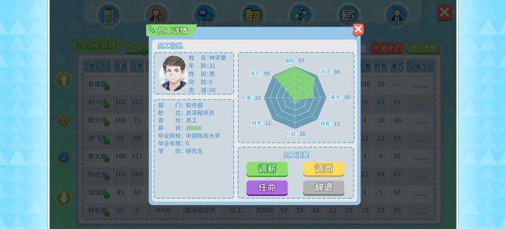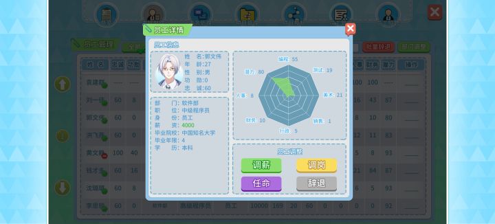 入职工号05年为一期生后续补06、07、08(09都是雷云老面孔)最后评选出浮生八杰001-主角002-黄文静 05年5月中级程序员 编程60 潜力93 薪水4000 备注:流水的剧情铁打的002,她不八杰谁八杰?003-沈璐璐 05年6月初级销售员 销售42 潜力93 薪水4000备注:来的早,提升快,初期唯一销售。004-钱财多 05年7月高级财务 财务84 潜力87 薪
