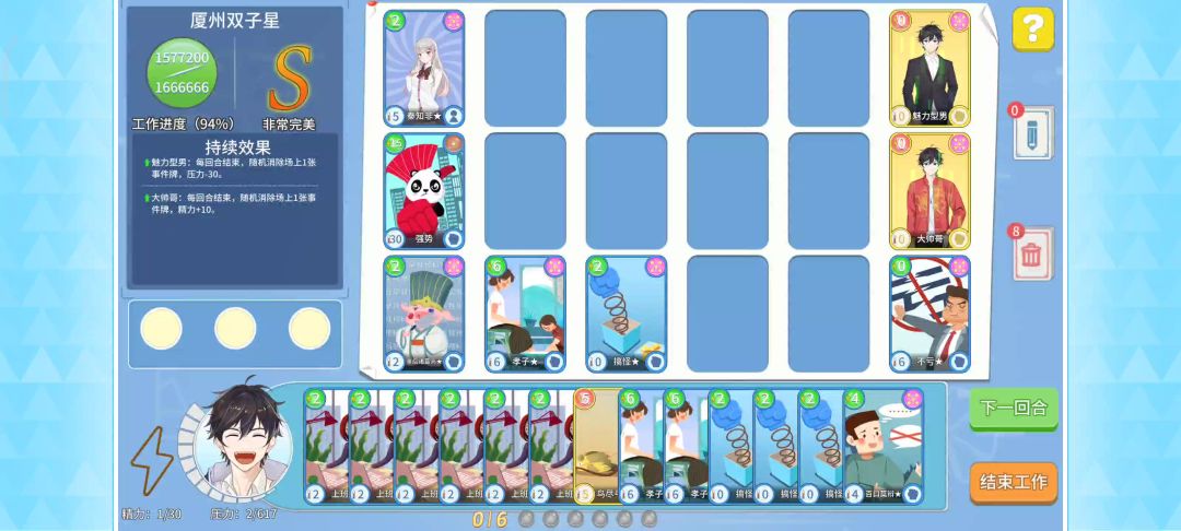 第一次玩这款游戏,应该有比我快多了的组牌法(毕竟一个回合才攻略2%,用一次就不想用第二次了),但还是想记录下给大家个参考[表情_羞涩] 核心就是利用强势过回合然后鸟尽弓藏和事后诸葛亮反复拿牌,其他的牌就是用来凑进度、攒精力、减压力的,个人感觉应该这套牌组可以应对一切情况(毕竟事故回合出不了#牌)[表情_送花]#职场浮生记攻略 #职场浮生记