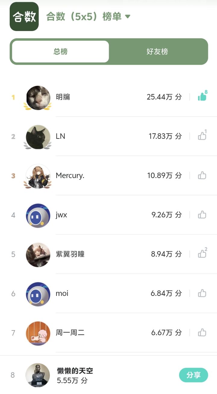努力了N把,几乎把把上万分,终于努力回到了“第八位”。。😨😨,几天没玩,回来一看排行榜被卷到了,都是什么大神??之前玩太多扫雷,数独,华容道。扫雷过了2500雷,数独关卡也都过得差不多,就是这个合数没怎么玩过。非常上头,一上手就停不下来,关键你们还这么卷,我这该死的胜负欲。 这一把干了三个多小时,真的卷不动了,累了累了,跑路。分享一点合数的攻略(精华):1.时刻关注上面落下来的数字,特别是“