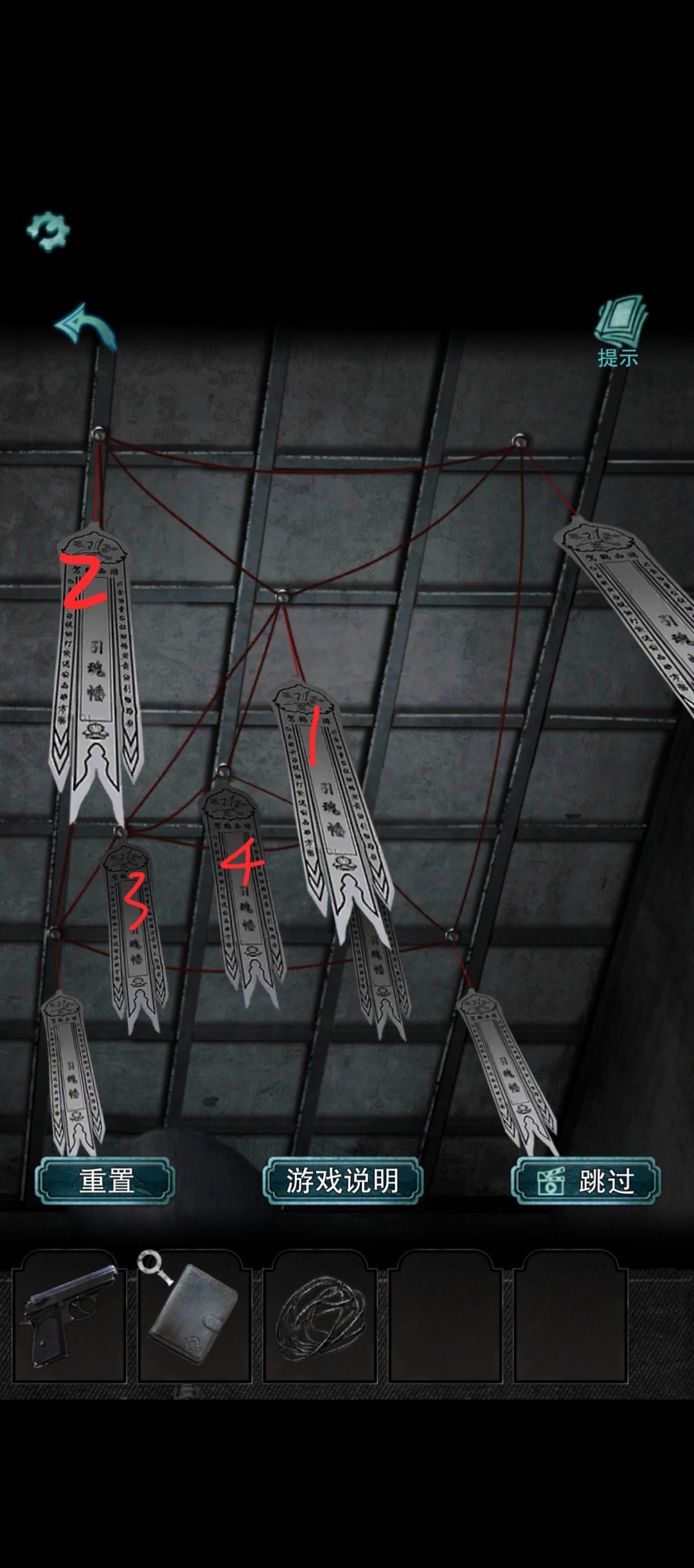 1.在棺材房检查村长手臂,得到面具颜色提示:红黑蓝。得到《刀刃碎片》和《菊的人偶》。 2.在手术室得到木偶身上的《打湿的布》,完成人偶脚下的倒水小游戏,得到《齿轮》。在面具房,在垃圾投放处移开福包得到《村长的人偶》,用打湿的布布扑灭火把。用刀刃碎片得到 《子弹》,用刀刃割开村长身上的绳子,得到《圆盘》 3.对手术室的柜子使用圆盘,完成小游戏。将人偶和子弹挂在天平上,点击档案袋得到提示。点击90A7