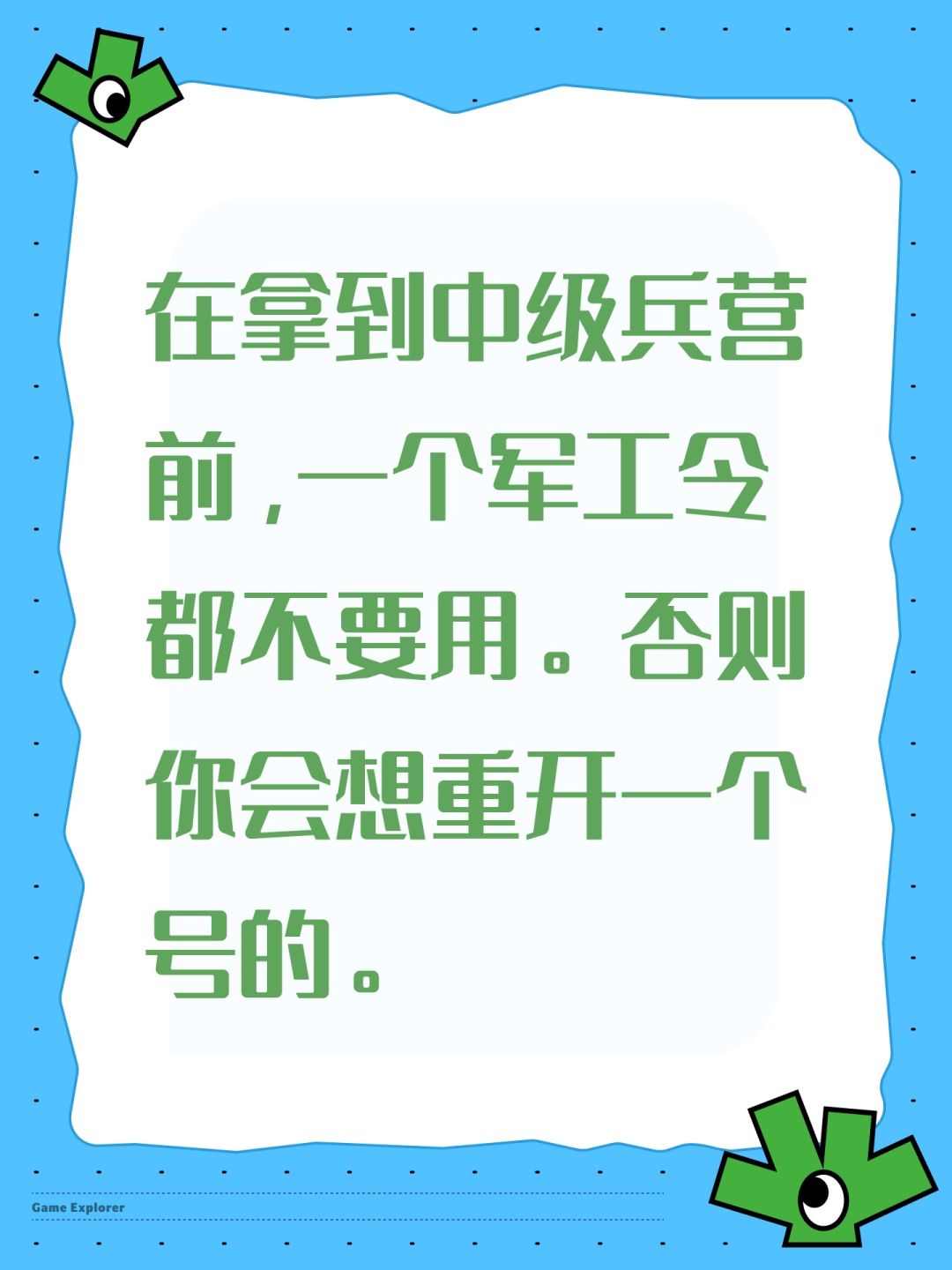 在拿到中级兵营前,一个军工令都不要用。否则你会想重开一个号的。 —— 该建议可以作废