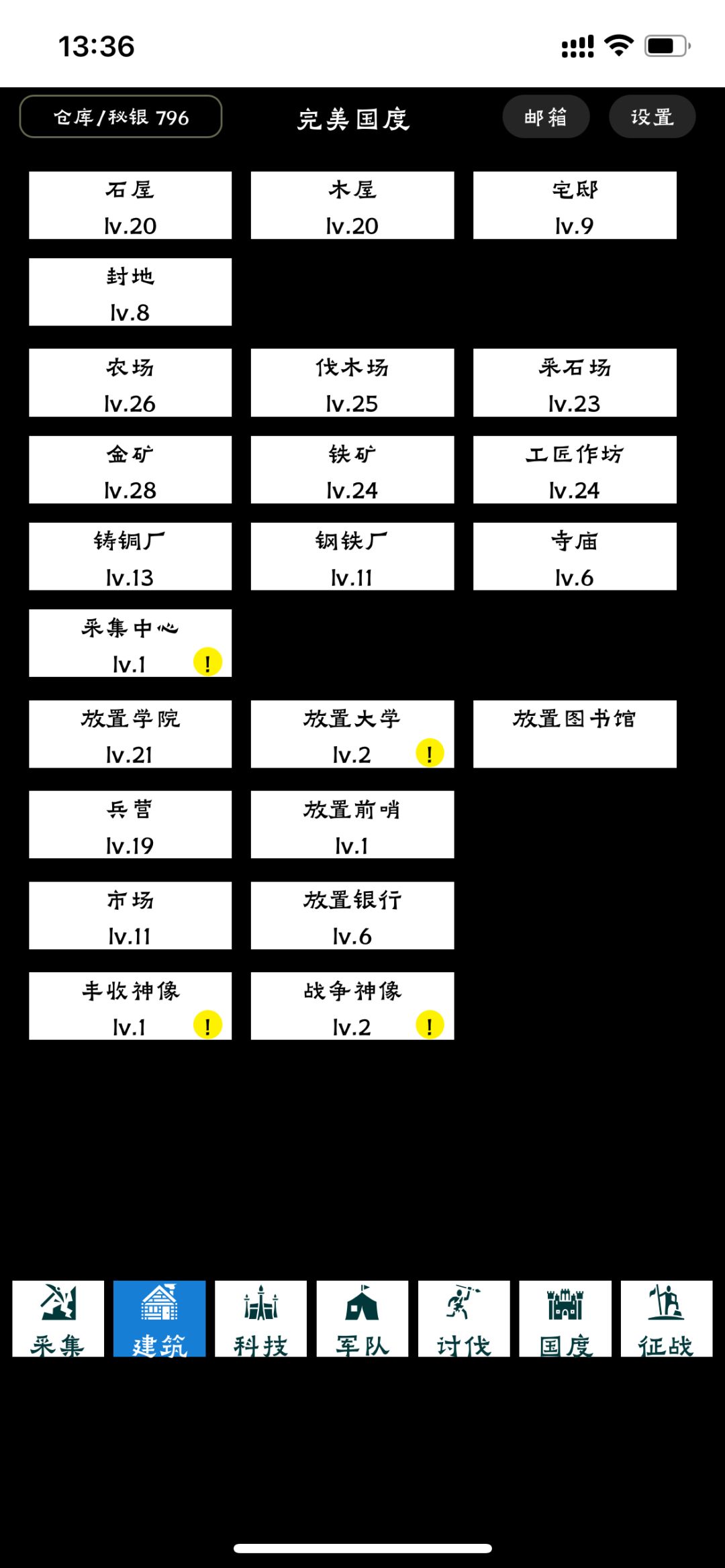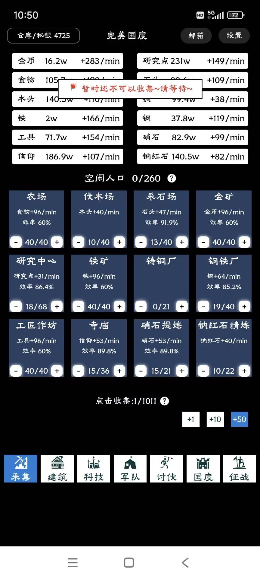 简易攻略: 1.开局点小石堆,建石屋(人口),点农场,分配人口农场。继续点小石堆,等有粮食就建伐木场,继续小石堆,建采石场,记得分配人口,好了,之后所有建筑先1级,接着主力石头和木材,粮食适当提升,让2个人口建筑(石屋和木屋)优先。 2.放置学院1级,开启科研。后面的路就围绕着人口和科技提升。第一天建筑资源优先金,木,石,粮科研。这个时候懂的都差不多。记得军功令不要用。后面科技兵营需要很多。有不明