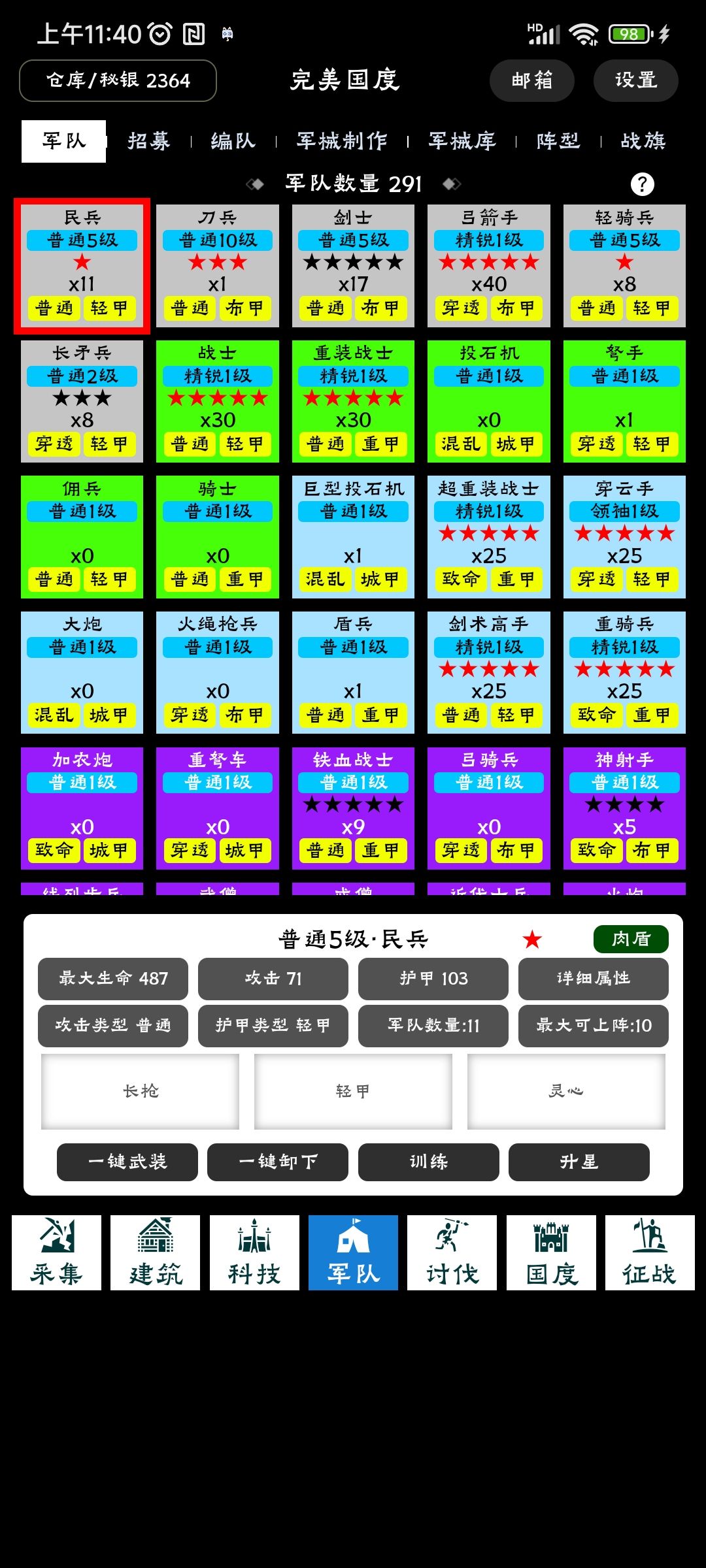 开局进游戏右上角设置签到,每天不要忘了,有 200秘银和军衔经验。然后就是点建筑升级,金币粮食木头石头前面都需要用到,第一时候开出征战,那里可以拿军功万国和秘银,千万记住记住记住军功不要用来招兵,一个都不要花,因为中级兵营需和高级兵营需要大量军功。前期可以用的兵有白弓,绿战士重装骑士,蓝超重穿云火绳剑术重骑。紫色兵可以去群里参考一下,毕竟数量多这里也没办法一一列举。