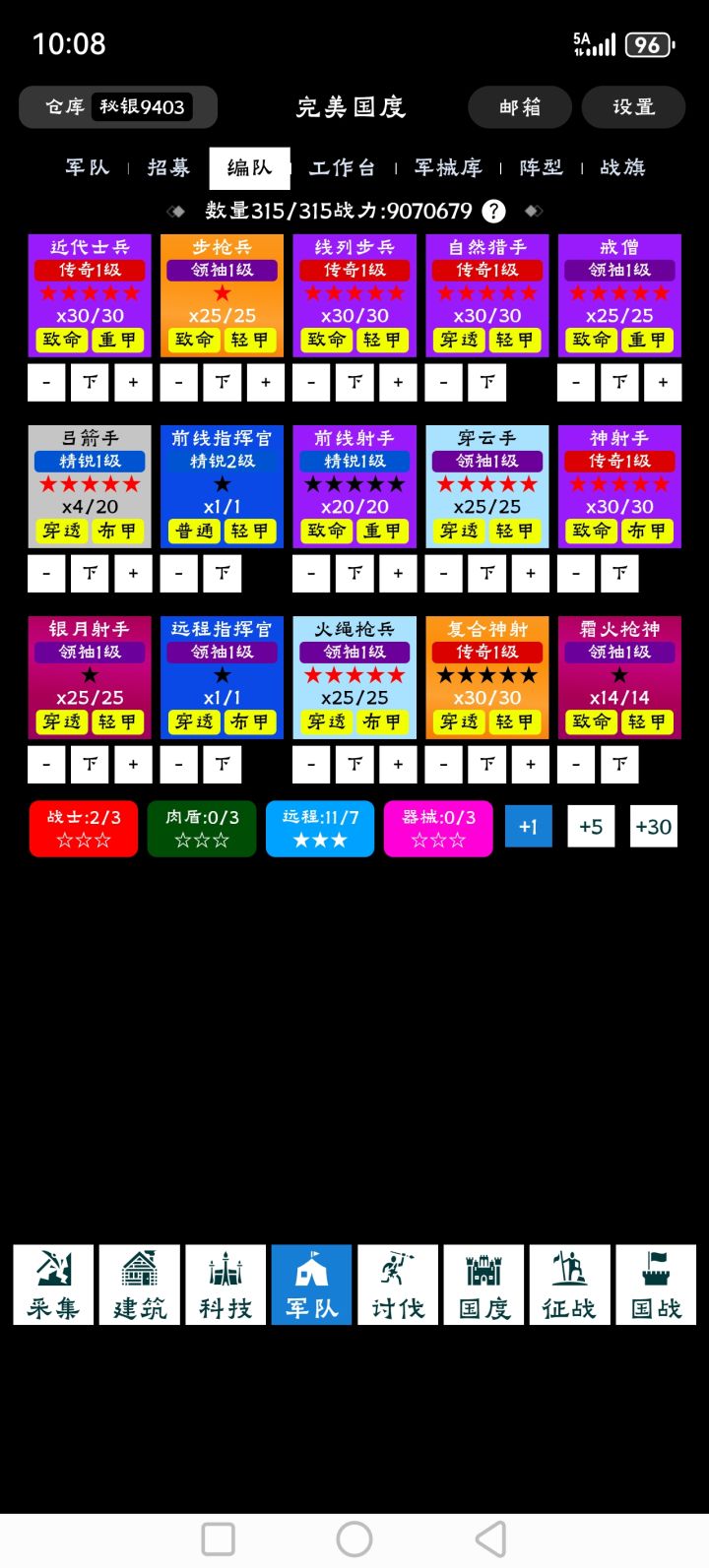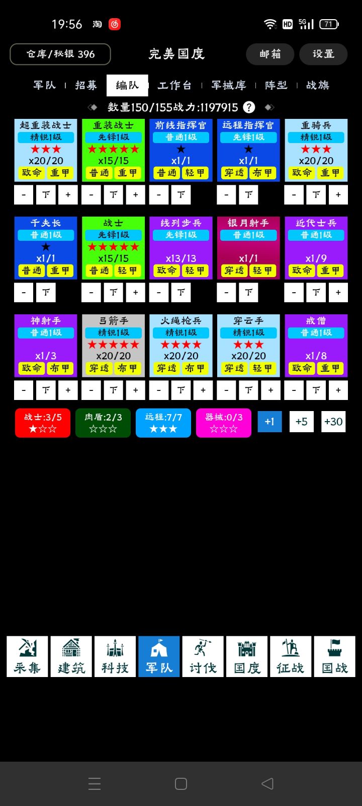 熬时间的游戏,时间久自然啥都有,一星期左右,已经中级兵营了!高级兵营还要时间,还不知多少高级兵!哪里有军功令1.签到没有2.tap签到时有3.讨伐进度136对应每天领36个4.战场每天打满有81个5.贸易每天三次时有几个6.国度百宝阁时有100秘银换一枚7.寻宝探索完用秘银换军功令8.其他,待补充9.建议先练普通兵,不耗费资源,中级兵太耗费资源了10.要不先点人口,要不先发展