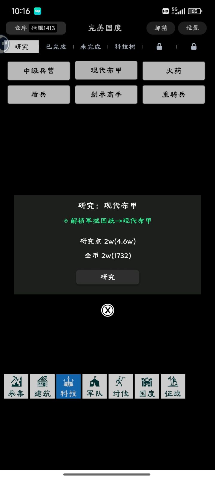 在游戏的前期,也就是满人口之前,整个发展的限制器就是科技,也就是研究点这项资源。不点科技不可取,但是盲目点科技一样不可取。在第二天成功点出征战和国度之后,到第六个人口建筑伊甸园之前,只有穿云箭(解锁最强蓝兵穿云手,但需要中级兵营招募),化学(解锁硝石),肥料(+5%食物),经济学(解锁人口建筑住宅区),新矿石(解锁纳红石)六种高收益的前置科技。而代价是51w研究点和其他各类资源共43w,其中包含前