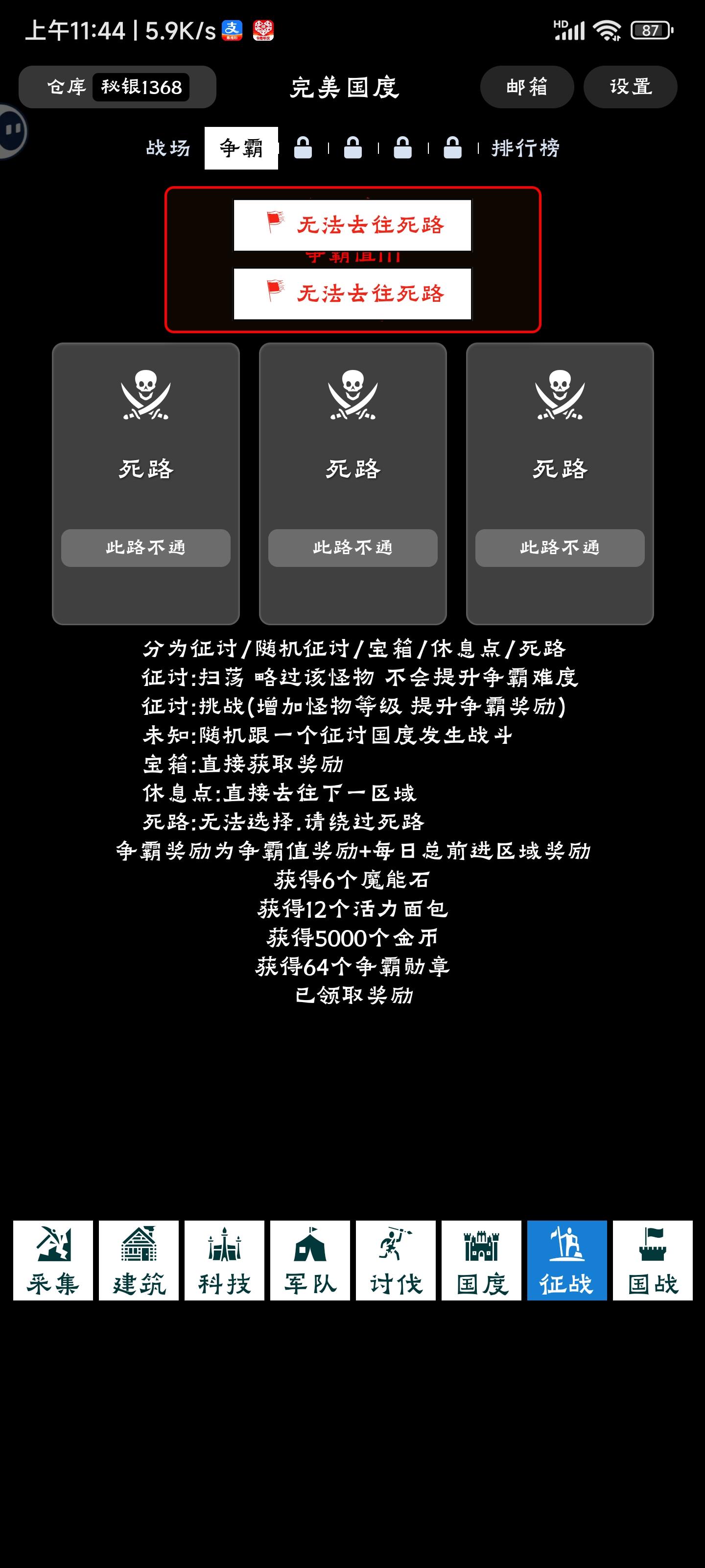各位玩家: 【完美国度】将于12月1日上午10点开启14服 |完美时代|,欢迎各位玩家。《完美国度》是一款模拟经营,放置类游戏,通过收集资源,建造各种建筑,增加人口获取物资,解锁不同时代科技,兵种等,搭配不同兵种进行模拟战争,讨伐,占领等玩法,我们持续更新游戏内容。欢迎各位玩家!taptap官方论坛领取礼包码。进群参与互动,获取游戏资讯,游戏会持续更新。游戏QQ官方群不定期发送各种礼包码。完