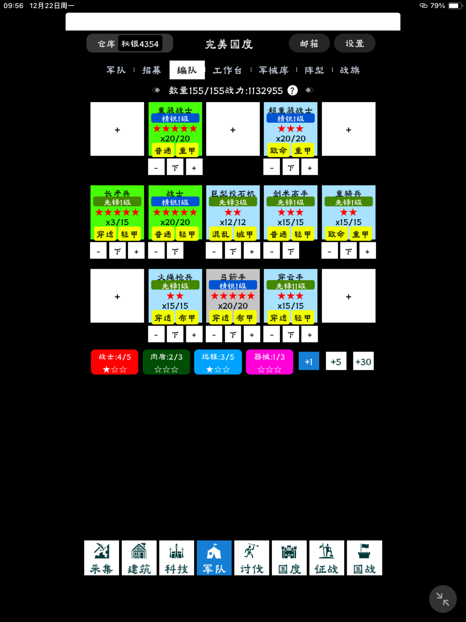 熬时间的游戏,时间久自然啥都有,一星期左右,已经中级兵营了!高级兵营还要时间,还不知多少高级兵!哪里有军功令1.签到没有2.tap签到时有3.讨伐进度136对应每天领36个4.战场每天打满有81个5.贸易每天三次时有几个6.国度百宝阁时有100秘银换一枚7.寻宝探索完用秘银换军功令8.其他,待补充9.建议先练普通兵,不耗费资源,中级兵太耗费资源了10.要不先点人口,要不先发展