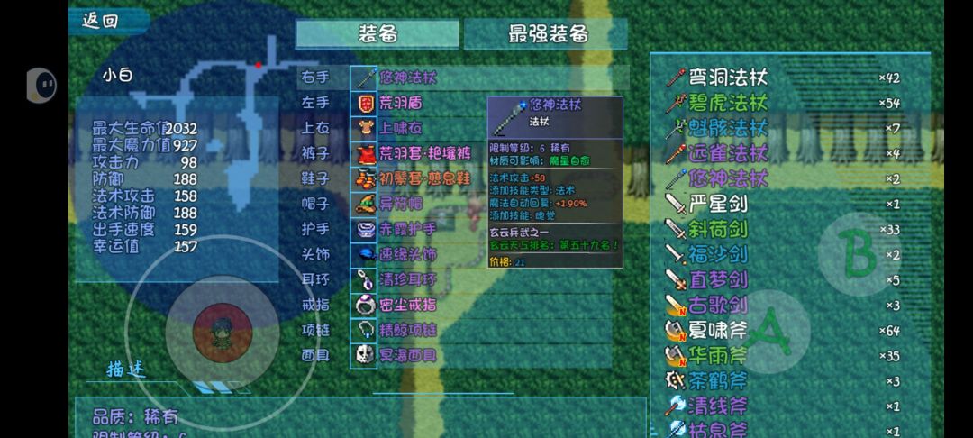远雀法杖(图一):+56法术攻击,每回合1.8%蓝量回复,造成2次随机伤害(普遍2×200+伤害) 获取方式:掌潭地图中领主boss本源虫掉落,图二为易出没点 悠神法杖(图三):+58法术攻击,每回合1.9%蓝量回复,造成6次随机伤害(普遍6×400+伤害) 获取方式:6级副本中域主级boss掉落