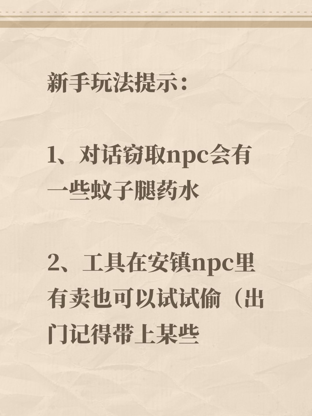 新手玩法提示: 1、对话窃取npc会有一些蚊子腿药水 2、工具在安镇npc里有卖也可以试试偷(出门记得带上某些地方没有工具过不去) 3、箱子暴力破开,因为用钥匙东西也一样 4、拿完关老二去1级图开刚。地图在上面(单挑也可以去) 5、武器有很多种。前期先斧子后期再法杖 (前面伤害不够用斧子必中但是得tp,后面法杖一回合秒) 6、本游戏无其他途径提升数值所以大部分伤害基本来源于技能。 7、本游戏无回复