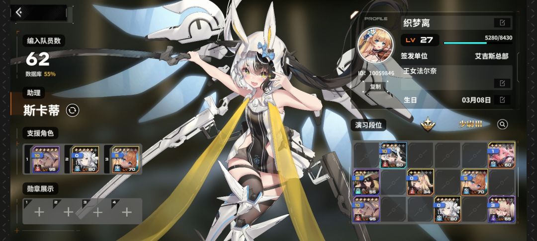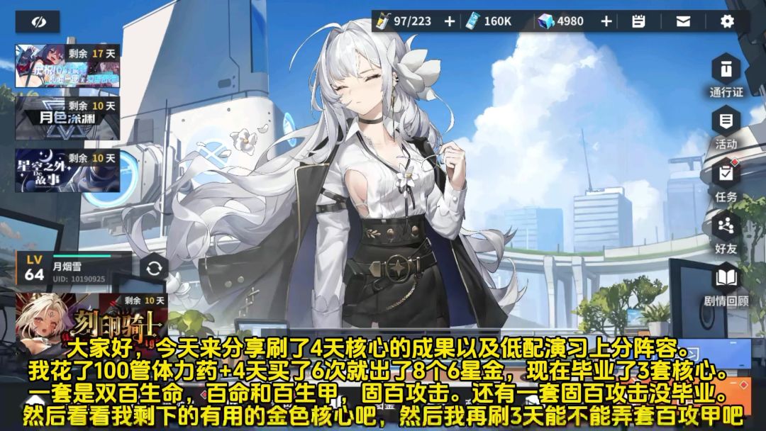 今天拉了一下复活盾,果然比我希强多了,附带一下今日的进度,为了避免被封所以没带皮肤。随便拉了一下核心囤了一下体力药,也没什么好说的 1Ps:一定要囤水晶,大佬们都在说下一个池子的泳装角色会是人权卡,建议屯水晶抽。 2Ps:新的自选池没有复活盾的建议大家都抽一只复活盾出来,法尔奈斯是真的强。有复活盾的可以考虑补个二命,另一个角色可以选首充的粉毛或者是自己想要的角色。 3Ps:无限10连抽出心纸后,千
