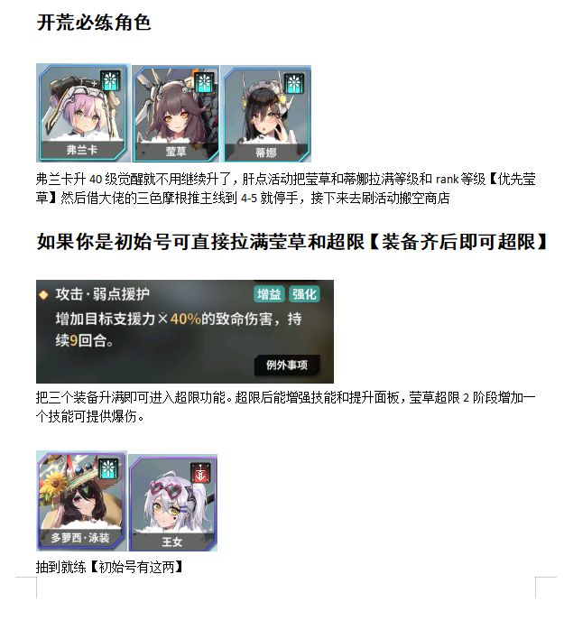 一 讨伐向 莫妮卡10 dlls(多洛莉丝辅助)10 宁(联动)10 萤草10超限2 芙露露10超限2 梅贝尔10超限2(超限2前用蒂娜) 弗兰卡(别超限,超限资源先给萤草) 荡漾兔(有一只就行了,不用升级) 法尔奈斯5(rank等级最后升,优先搞血量,r5是多个嘲讽) 普瑞西欧 梅尔 罗德尼亚(就用送的r5就行) 以上先把梅尔,普瑞搞到能用,再去搞辅助,不用着急执着rank等级,够用就行,