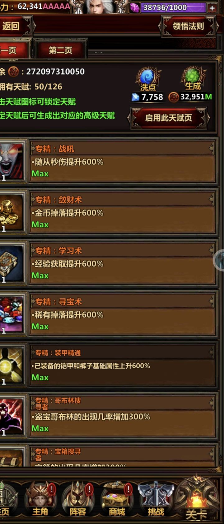 战斗天赋一共22个,挂机天赋一共20个!!还有就是装备宝石全带加生命的,这游戏生命流就是最强的,有什么不懂的可以留言,看到了会回的!! #暗黑主宰攻略 #天赋