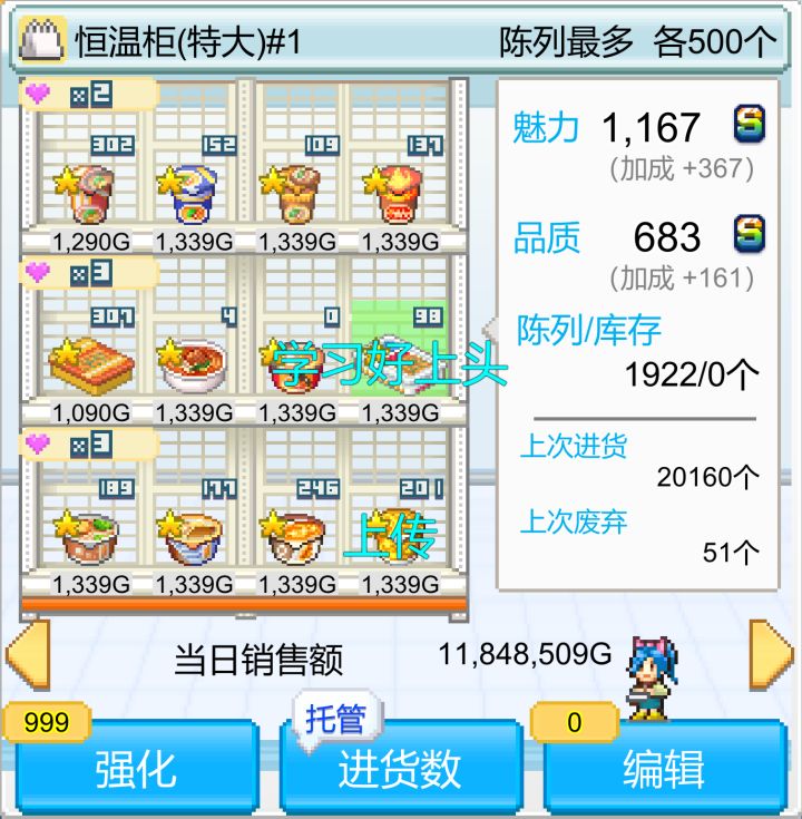 最近才开始玩这款游戏,边玩边琢磨了些前期可用的东西,以下都是目前见解,玩到后面会改善(第一次开局不行,破产了哈哈哈哈,重新开局认真琢磨了下)前面先说一些废话开局要记住:别破产+开发新品(为了满足顾客愿望,这样进店率提高,最终实现赚钱目的)前期刚开始少安装一些设备+店外东西,因为会消耗创意(也就是用来开发新品的💡),不仅顾客的愿望需要新产品,你搭配货架也需要新产品,所以创意很重要!!