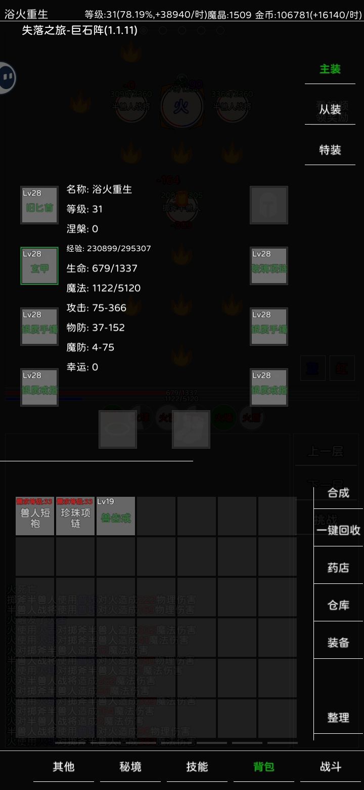@“•᷄ࡇ•᷅” 1.1.11(27)版攻略1升级开局先选火,升级为主,有空就打打密境1,等到了40级之后可以把密境全打一遍。再涅槃,涅槃需要一千魔晶,魔晶来源。看广告和密境1Boss金猪。涅槃之后选火墙技能,再选战。之后升级为主,有空可以打密境1,等满级50级之后再打苍月4神兽和密境,可以几次。然后可以涅槃也需要一千魔晶。涅槃选火墙和猛击或者雷霆一击,再选木。升级为主,有空打密境1,升到