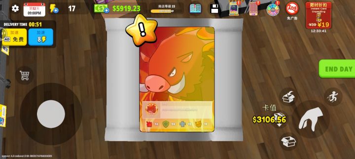 在店内,你看到的绿牌就是休息,红牌就是营业。点击购物车界面进入商城,购买货物。除了卡包32,其余货物第一次购买的都是购买凭证。最好买数量多的,比如卡包64这种。因为你每次购买会有一个送货时间,闪电状的体力最好别乱用,不然后面就是一个劲看广告拿体力解锁凭证,没错后面的商品购买凭证要花费体力买。订的货到货后,根据提示打开箱子,屏幕中间小白点对准货架空着的地方点击“手心朝下”的按键,会把货物摆