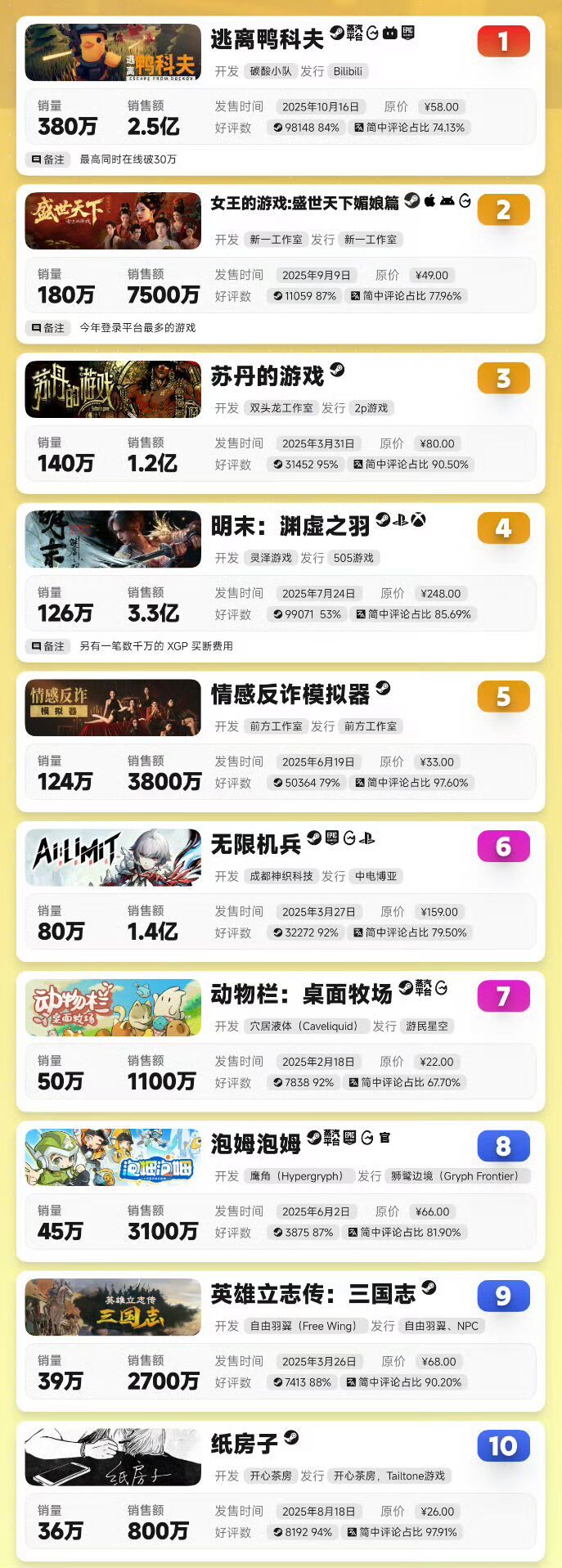 【快讯】2025年国游销量发布逃离鸭科夫登顶