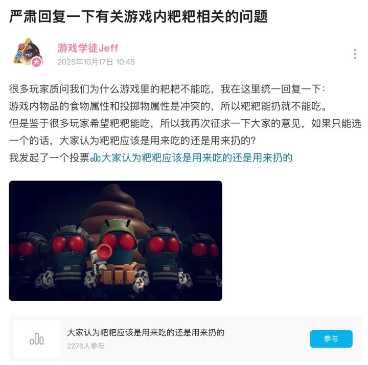 当其他游戏还在卷画质、卷玩法时,《逃离鸭科夫》用一句"按F吃粑粑"成功破圈。这款由5人小团队打造的独立游戏,上线不到两周销量突破200万,Steam同时在线峰值超30万,成为2025年最令人意外的爆款。游戏最出圈的"吃粑粑"梗,其实源自一场玩家与开发者的趣味互动。最初游戏中的"粑粑"只是投掷道具,在玩家强烈要求下,制作人Jeff发起投票,最终58%的玩家支持将其改为可食用道具。更戏剧性的是,粑粑