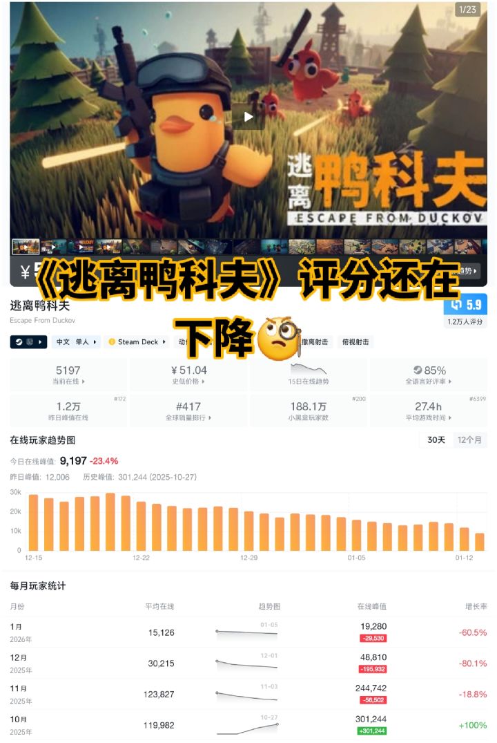 《逃离鸭科夫》评分还在下降🧐