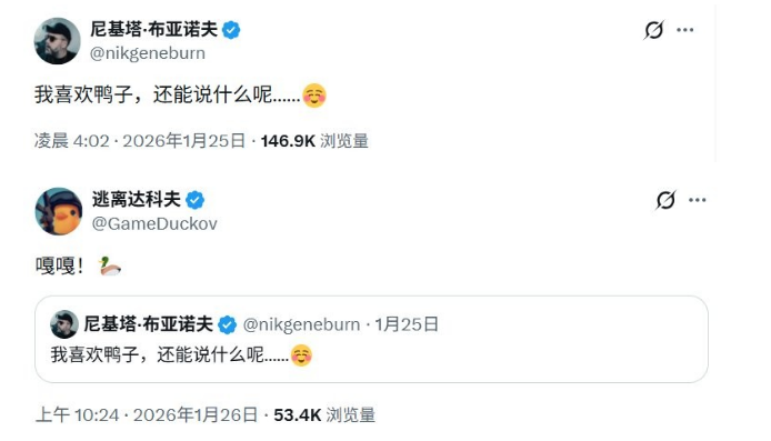 国产独立游戏《逃离鸭科夫》之前宣布将进行游戏首次联动,而联动对象被玩家解谜出是游戏本家《逃离塔科夫》。而这两天,两家官媒再次进行神秘的互动让玩家更加相信游戏联动即将到来。 1月24日,《逃离塔科夫》开发商Battlestate Games的官媒账号发布了一则公告,上面写着:“一次狂野狩猎即将开始,你准备好猎鸟(可能是指鸭子)吗?还是成为其他猎人枪下的猎物?”并在下面配了一张印有鸭子的标靶。联