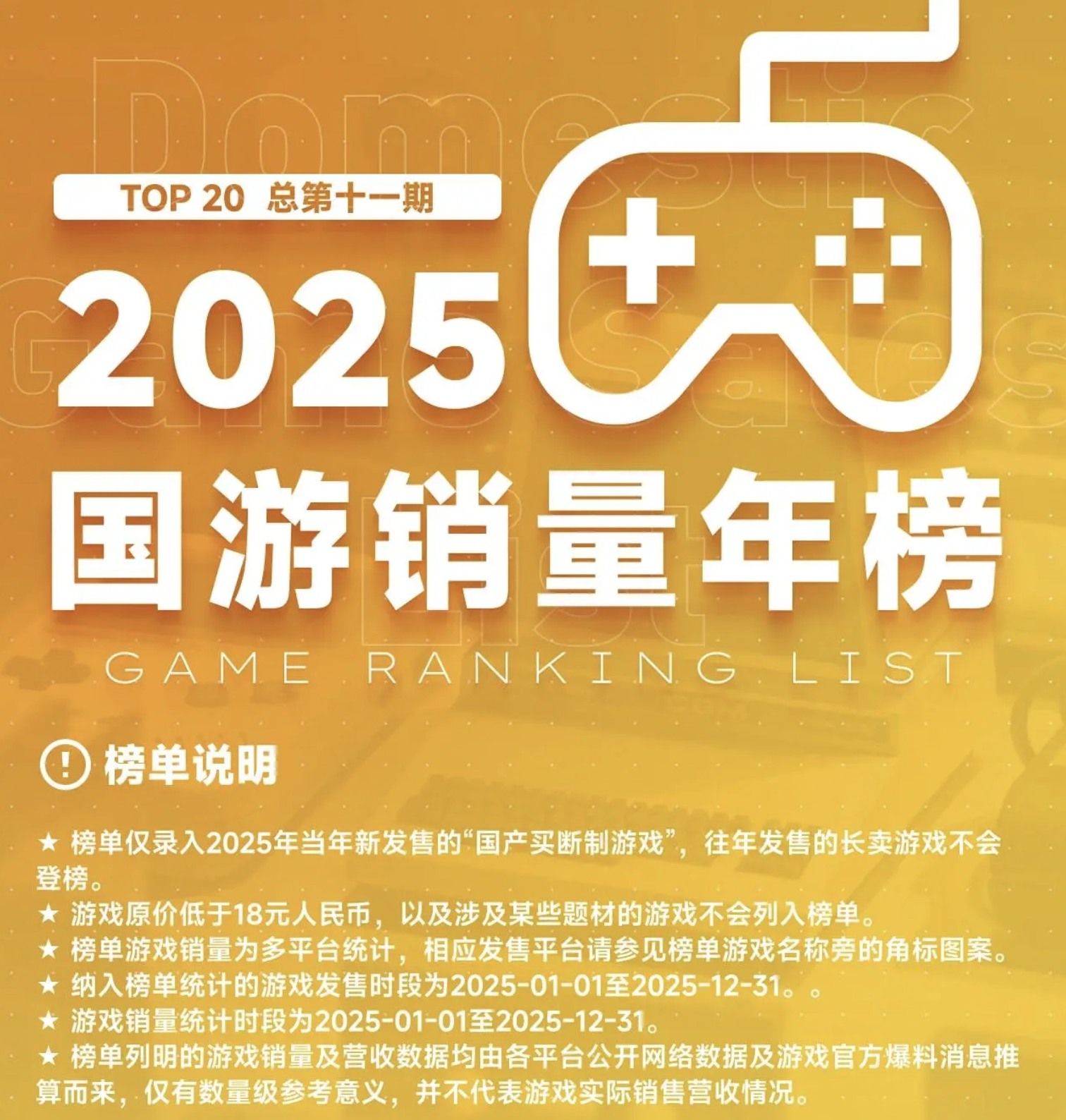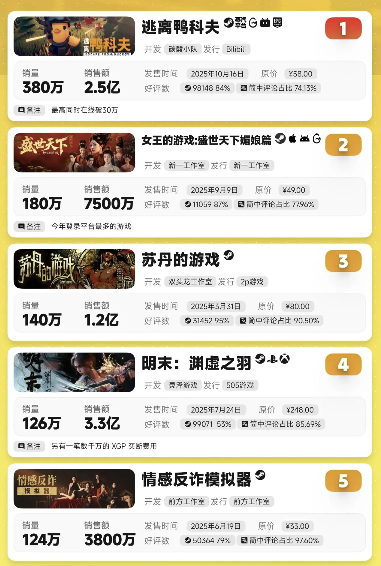【快讯】2025年国游销量发布逃离鸭科夫登顶
