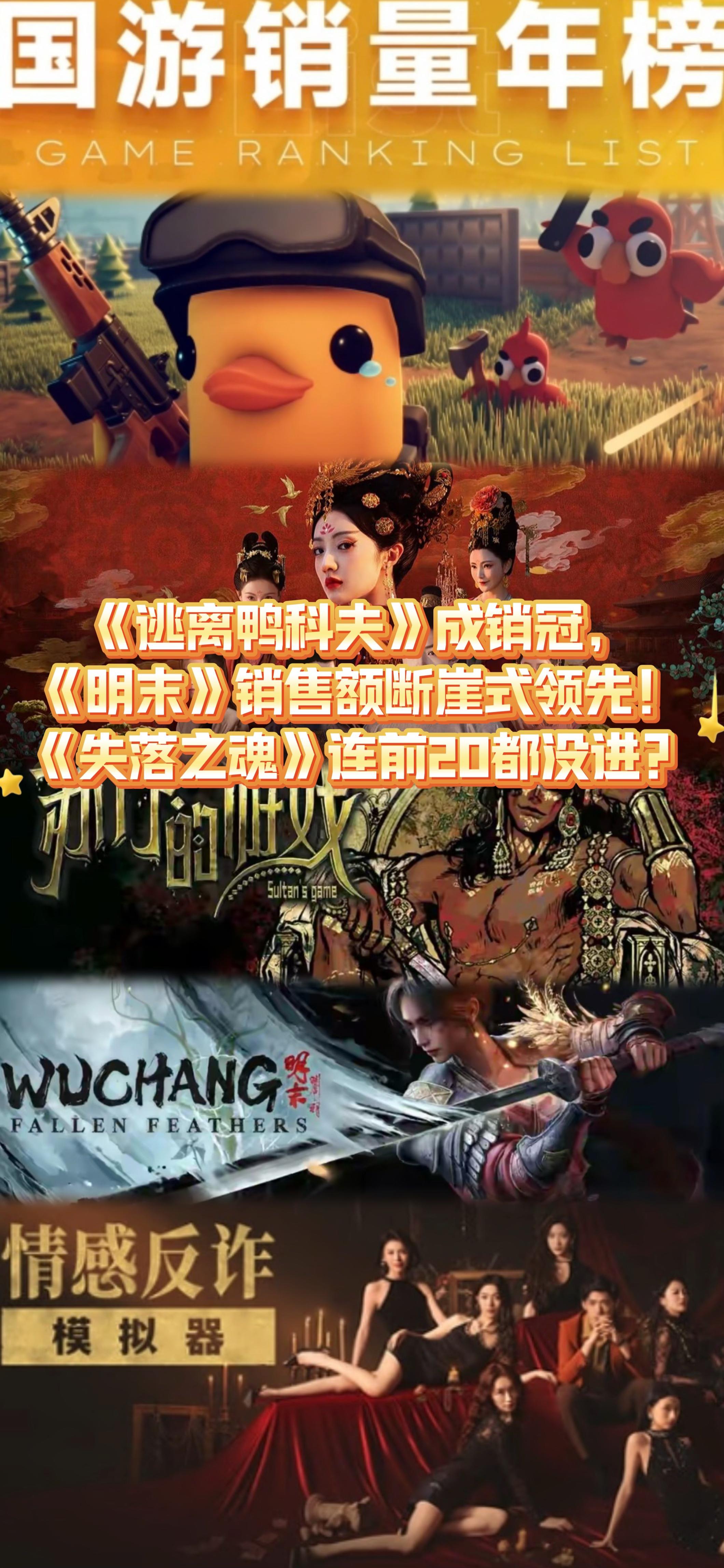近日备受关注的2025年国产买断制游戏销量榜正式发布,报告显示,2025年国产买断制游戏总销售额达到31.6亿元人民币,同比增长了17%,创下历史新高相比往年,今年可是破纪录的一年,原因为有五款游戏销量过了百万,这在以前可不多见。登上百万销量宝座的游戏包括《逃离鸭科夫》、《盛世天下》、《苏丹的游戏》、《明末渊虚之羽》和《捞女游戏》(也叫情感反诈模拟器)。其中《逃离鸭科夫》以380万销量强势拿