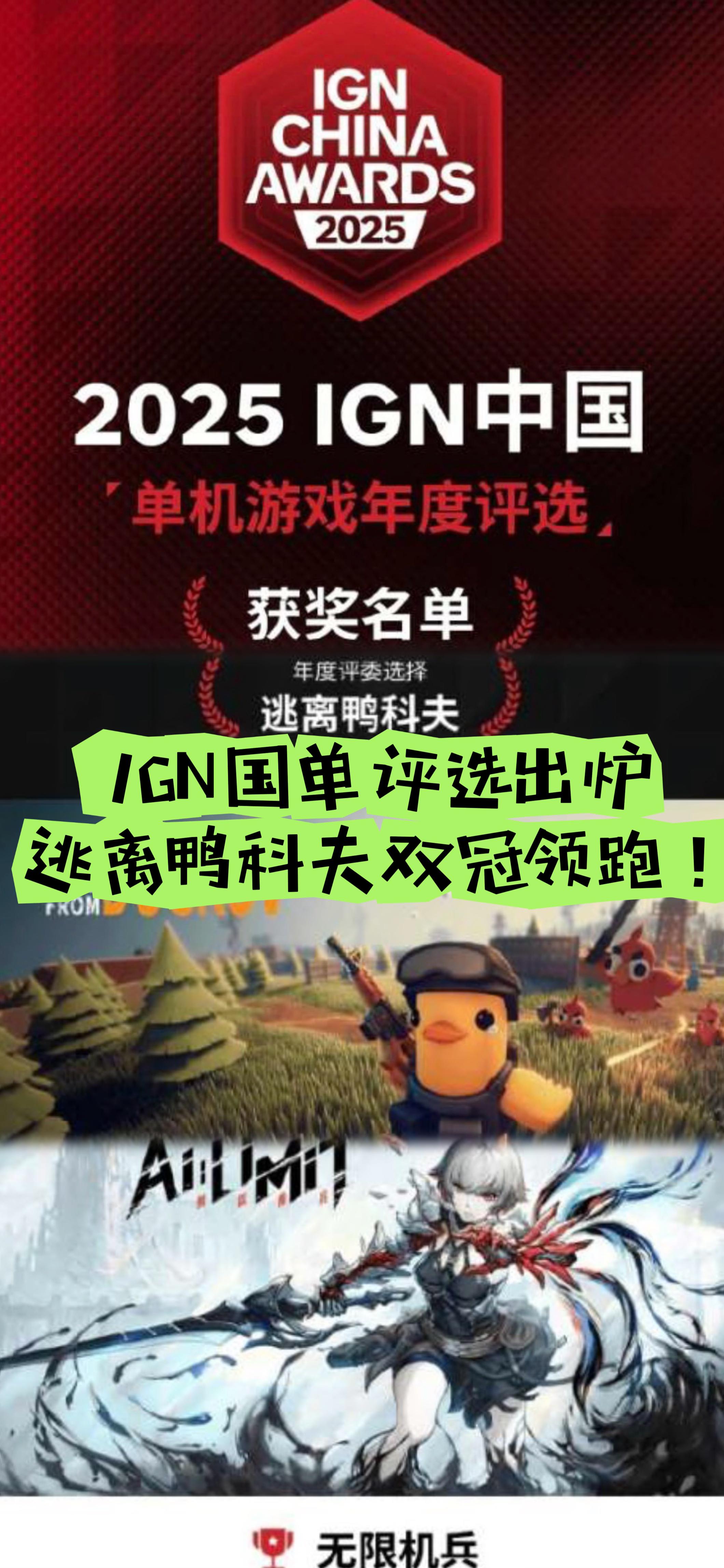 IGN中国首届IGN China Awards国产单机年度评选结果正式公布,评选覆盖2024年11月至2025年10月上线的国产单机作品,以编辑评审+玩家投票的双轨模式,评选出七大奖项,全面展现国产单机在创意、品质与人气上的多元突破。《逃离鸭科夫》成为本届评选最大赢家,包揽年度国产单机与年度评委选择两项重磅荣誉。IGN中国编辑评价其以精巧叙事与细腻情感表达突破题材边界,彰显独立团队的创意爆发力