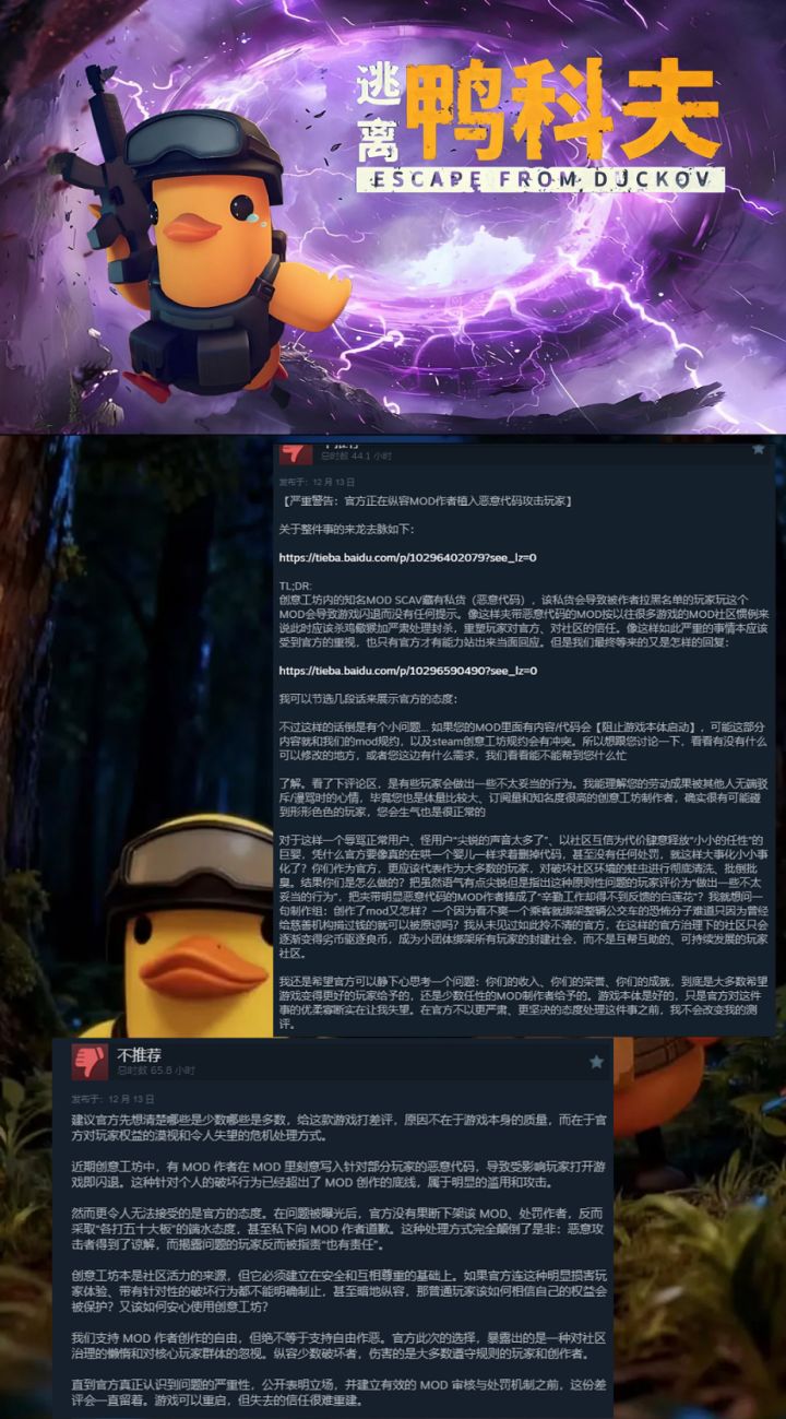 国产射击游戏《逃离鸭科夫》官方在12月15号终于出来滑跪道歉了。 事情是这么回事,创意工坊里有个叫【Scav模式 1.8.0】的MOD,作者在里面藏了点脏东西(异常代码),被这作者拉黑的玩家会出现游戏直接强制闪退。一开始,网上传出来官方跟那MOD作者低声下气的沟通截图,说好的对恶意代码零容忍呢?这下好了,Steam上一下子多了500多个差评。现在官方出来发公告承认自己错了,说两大失误:一个是