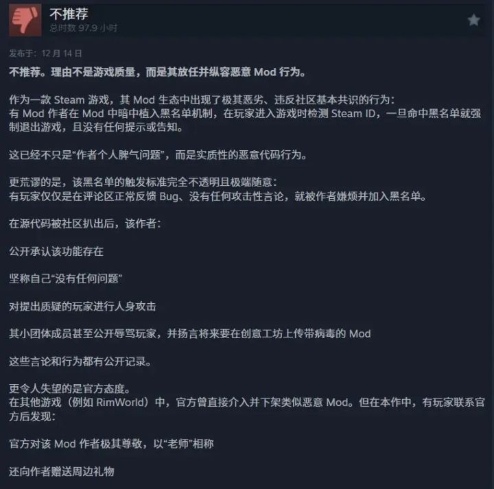 从99%好评到单日好评率暴跌至7%,这款靠“萌系+硬核”圈粉的游戏,短短几天口碑翻车得猝不及防。说到底,还是恶意MOD和官方的摆烂操作太伤人心。 那个带恶意代码的MOD有多离谱?拉黑玩家就强制闪退,哪怕你没启用它,只要电脑里有相关文件就中招。这哪是模组,分明是作者的“私人黑名单武器”,直接剥夺玩家正常玩游戏的权利——这底线破得够彻底。 更气人的是官方的处理:出事先想着和稀泥,跟作者送周边求