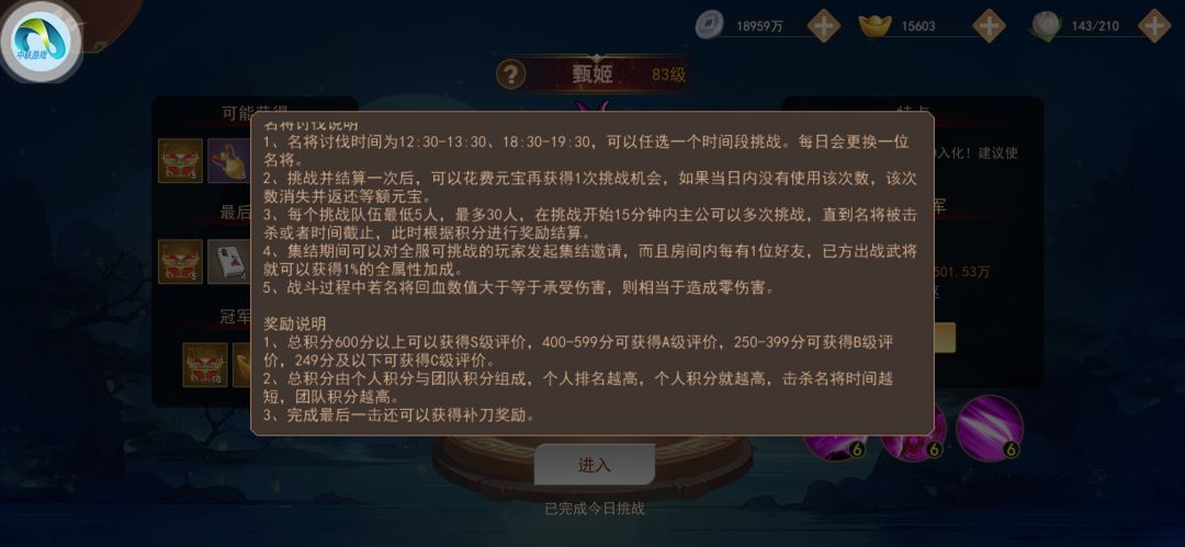 今天跟大家聊一聊名将讨伐与列传这几个活动的玩法与自己的一些心得。名将讨伐是一种每天12点30到13点30以及18点30到19点30开放的一种跨服式的玩法。说是分成SABC四种奖励等级,但据我多次活动的经验,就算你一点伤害还都没有,但是这种BOSS一般都很好打过,队友打完BOSS你也能获得A级评价。S级奖励有5个BOSS信物宝箱,5个花雕美酒,80元宝以及4个白色君子命签,A级奖励为4个BOSS信物
