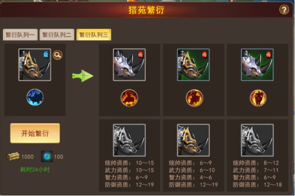 一、前期技巧 1、繁衍开启的前提:任意猎苑达到9级。 2、【重点】:繁衍时坐骑不需要升级或升阶,属性只受基础值影响。 3、开局先把所有猎苑升到3级,注意,最后一个披毛犀苑升到3级后,暂停升级,直到取得公的单厚脂坐骑后才考虑继续升级。因为前期公的单厚脂坐骑很难获得,所以,披毛犀苑只升到3级,获取公的单厚脂坐骑就相对比较容易。 4、猎苑升到3级、6级、9级后分别激活三个坐骑技能。每个猎苑最后一个技能