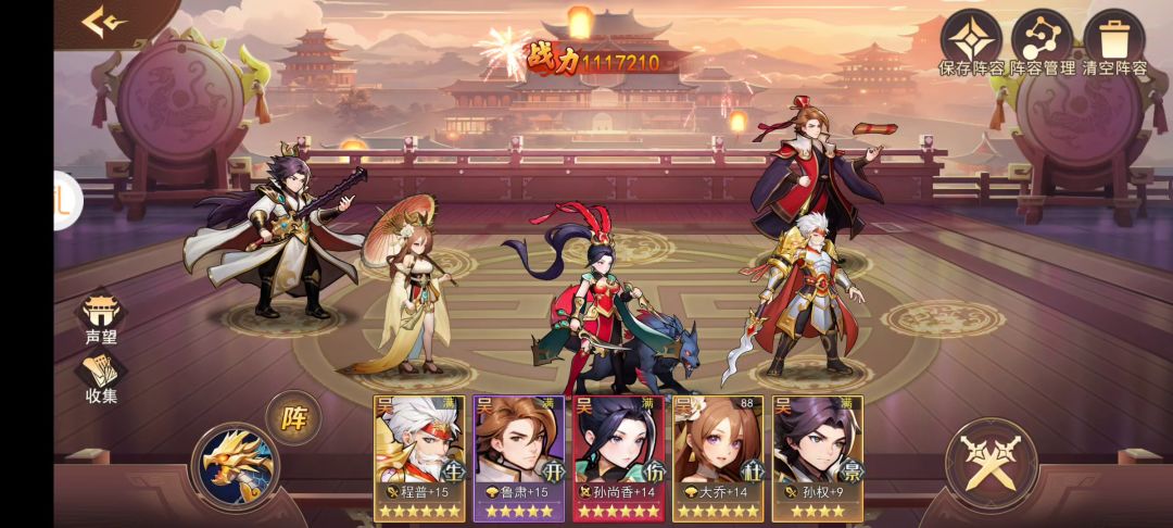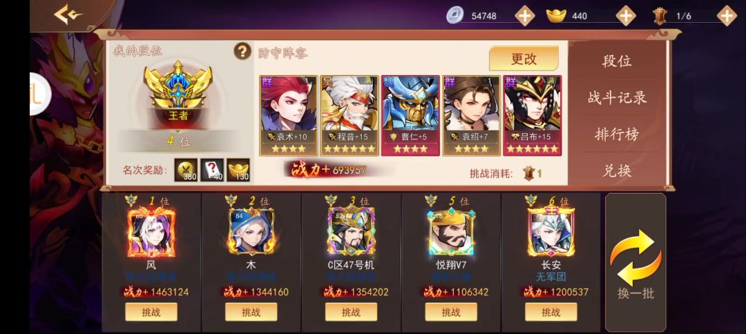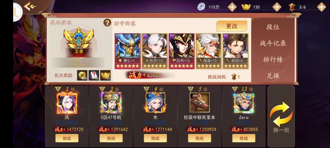 65万战力打120万战力。对面长安四个+15,一个+13曹仁。我方一个极限养的吕布,随便养的+15程普,三个挂件