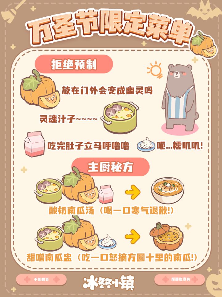 欢迎光临——本店万圣限定菜单限时上架中,欢迎新老顾客进店品尝~🥘酸奶南瓜汤一口下去都是绵密的甜香,再由酸奶轻轻收尾~🎃甜噌南瓜盅表面焦香,心里柔软,咸甜交错的滋味让人上头!*所有南瓜都来自小镇农场的现摘直供,连增味汤都是由员工亲手调制~吃完记得说“谢谢南瓜”!#冰冬冬小镇 #模拟经营 #治愈 #美食 #种田 #建造 #开发者日志 #万圣节