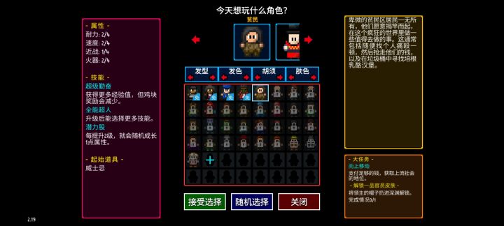 (可能带有剧透)像素风的游戏上帝视角游戏音乐一般,游戏剧情讲的是从底层当上市长或者是推翻市长,游戏主要目的是推进关卡完成大任务然后进入下一关的肉鸽游戏,游戏中有不同的角色例如:治安官.小偷.外星人等角色,在完成角色大任务后通过突变能玩到,加强版的角色,在体验正常关卡玩腻了后,可以自定义游戏以及在游戏中收集对应的鸡块,可以解锁角色或者是开局购买道具等,对于它这个价格来说,这个游戏内容很值,并且到现在还在一直更新,并且游戏支持联机,可以和好朋友一起玩。
