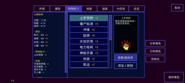即使只有20点点数和8个技能槽位,一堆负面的自定义角色依旧超模,即使是开突变,用超级角色也没几个能强过自定义