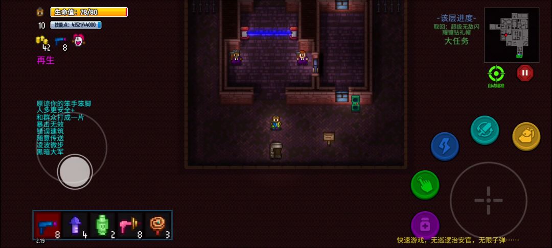 目录:基础介绍 | 操作介绍 | 职业体系 | 技能说明 | 物品说明 | 任务说明 《迷城陆区》是一款rogue-like类俯视视角像素rpg游戏,原作是Steam上的《地痞街区》,游戏中你的角色会接到一些街头任务,你要做的就是:不说话,直接莽~ 常规的移动端操作方式,直接看图~~ 游戏共包含24种职业,其中6种为初始可选职业(如战士、大猩猩等),剩余18种需通过完成特定关卡解锁后方可使用。 自