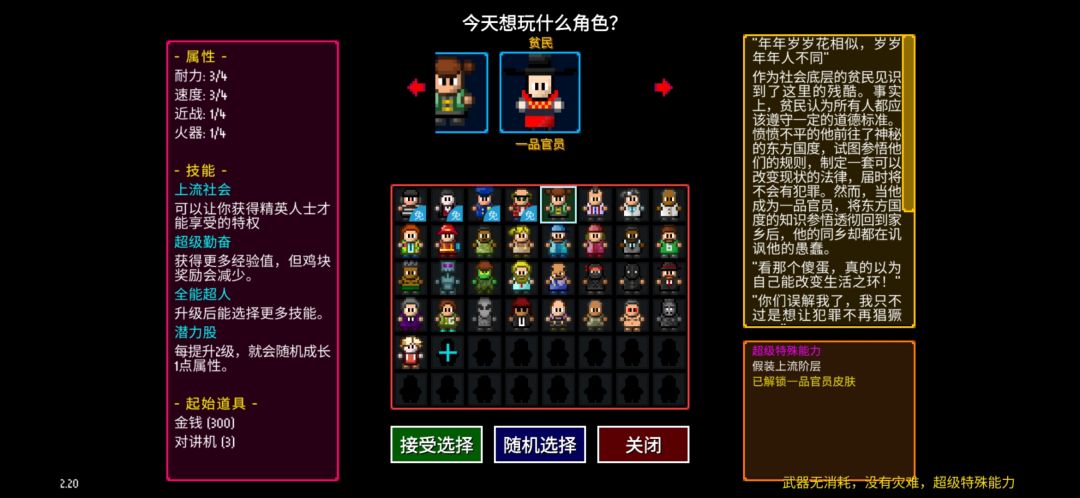 一、职业选择游戏初始有街娃儿、战士、医生、键盘侠、夜耗子这 5 种职业,后续还有超 30 种风格各异的角色等你解锁。新手强烈推荐战士,血厚近战猛,开局自带 50 发子弹的机枪,血量低于 20 自动回血,升级后 40 血就能自动恢复,一路莽穿前期关卡。要是你喜欢猥琐发育,黑客是不二之选,凭借笔记本电脑远程操控电器,偷偷破解电脑积累资源,放毒输出,后期堪称轮椅战神。想体验轻松乱杀的快感,僵尸职业很合适