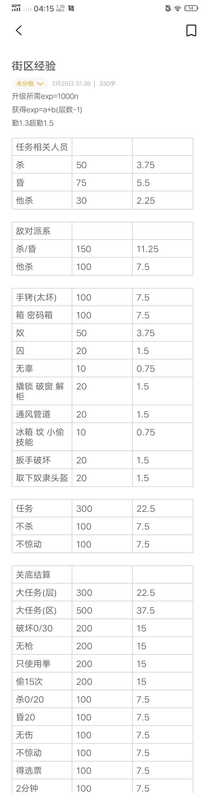 【攻略转载】街区经验获取统计表