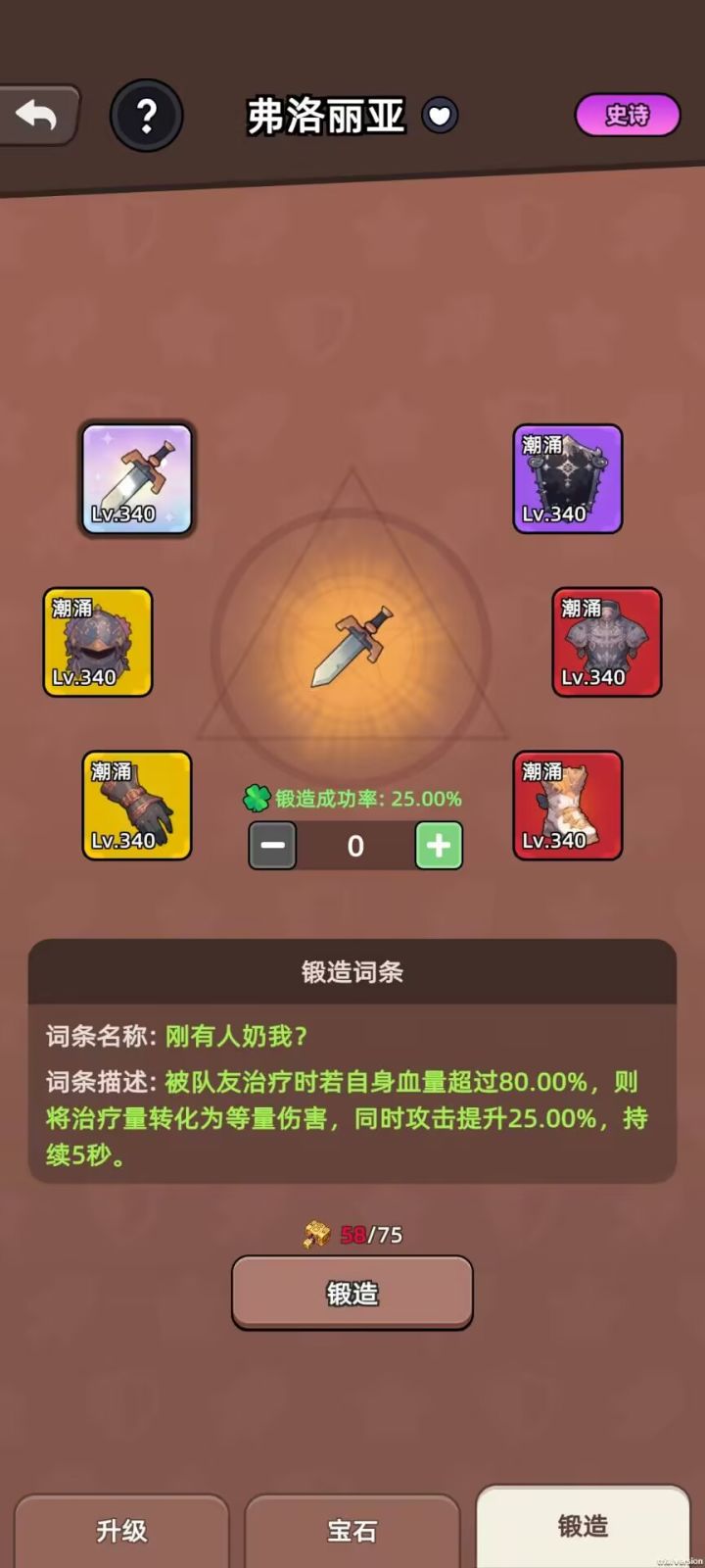 营地55级后,可在装备锻造界面将【神话】品质提升至【鸿蒙】品质,并给装备赋予特殊词条效果。同一个勇者相同词条效果不会叠加,使用幸运草可增加锻造成功率,但效果会逐渐递减。下面是目前游戏中所有词条列表,后续新增会修改本帖,也可以在游戏锻造规则弹窗查看:迫不及待刚加入战斗时,自身移动速度提升100.00%,持续5秒。怒气永动机每次释放技能,都有25.00%几率返还技能消耗怒气的25.00%怒