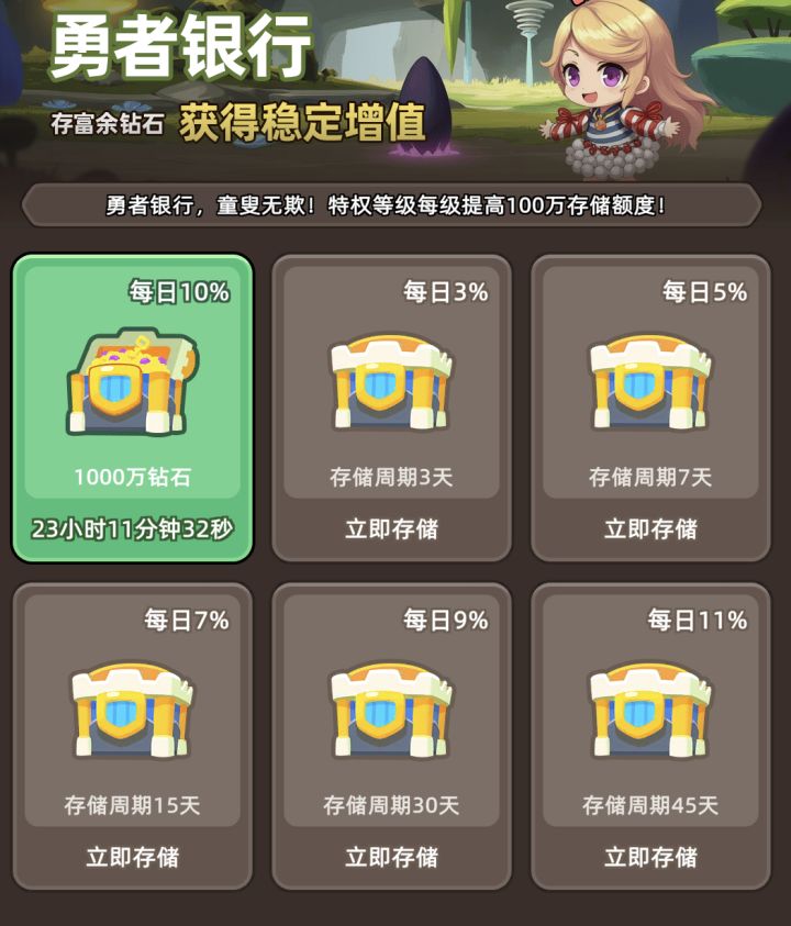 自《勇者不能停》钻石银行开业以来一直饱受争议,期间版本更新大幅度提升过一次利率,但还是达不到极少部分玩家的心理预期。是否需要存储全凭玩家们的感觉,下面是对钻石银行的一些规则解释:最终本息 = 本金 * (1 + 日利率 * 存储天数)例如,10000钻石存储1天:11000 = 10000 * (1 + 0.1)可以提前取出本金,但不会获得利息,也不会有保管费。1.1.7版本后以此规则