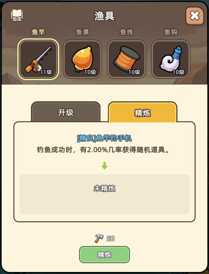 渔小屋玩法中,当所有渔具达到10级以后,可以开始对渔具精炼词条。相同属性类型词条效果区分品质(优秀 -> 神话),不同品质数值不同。除了精炼词条,还可以升级渔具提升对应的属性。注意:不同渔具相同属性类型词条效果不会叠加数值!!!精炼后要点【替换】才能让新精炼的词条附着渔具之上!!!小鱼成群钓到小型鱼的几率增加3.5%-17.5%。中鱼挡路钓到中型鱼的几率增加3.5%-17.5%。巨