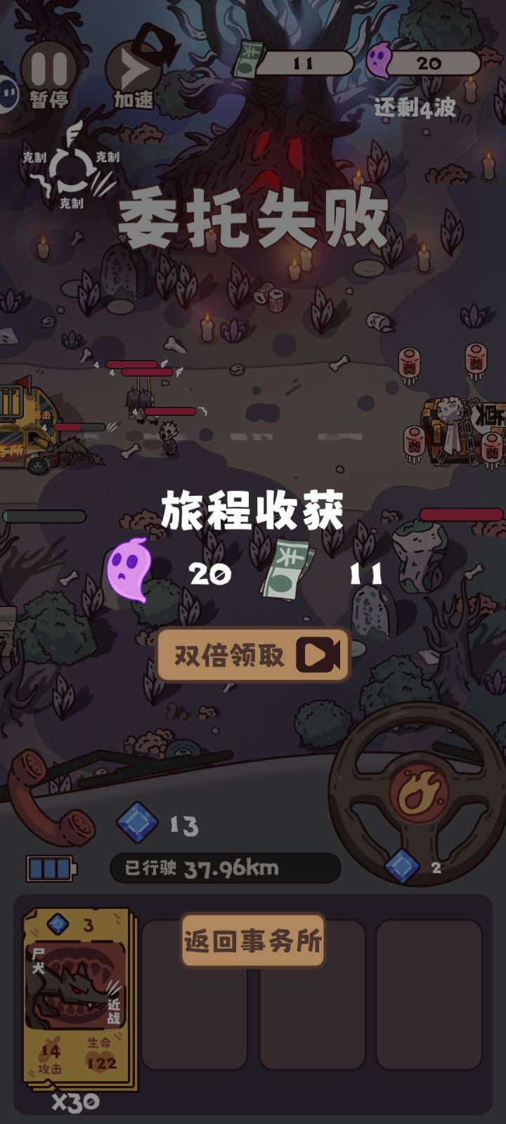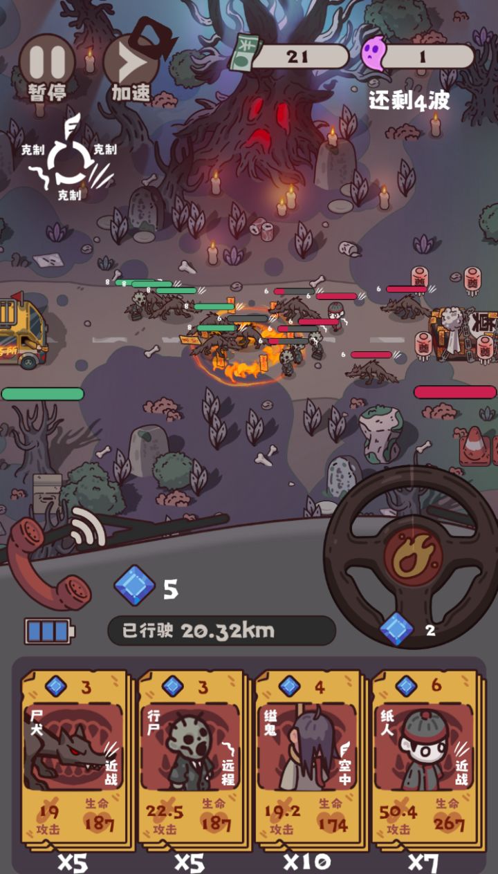 算是打了3关吧。第一关教程关,和2、3关。关卡方面,真就是纯重复。 然后玩法上,召唤物尽量能少召就少召,就是起个肉盾的作用。主要靠那个2费的火法打伤害。召唤物数值。10级狗21攻、213血。7级行尸21攻,174血。个人建议是,前期尽量优先升狗,指着靠它抗伤害聚怪的。车辆改装,优先点平砍和技能,然后是防御。至于第一个开槽,建议直接无视。在关卡中缺的是蓝点费用,不缺召唤物冷却,也不指着